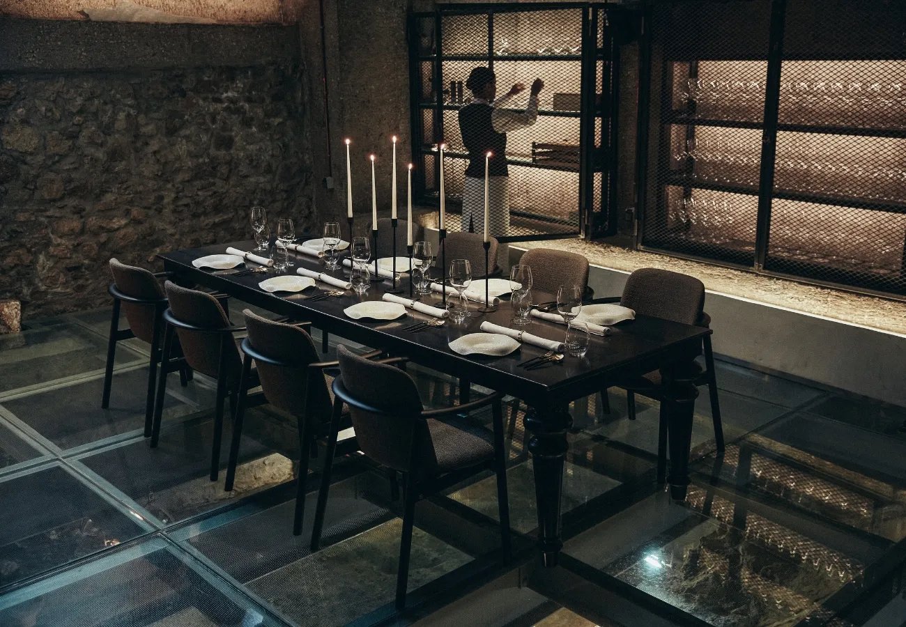An impressive private dining room and wine cellar below–named Atiki, Athen’s ancient name–features a glass floor that allows diners to gaze upon the ancient ruins of the Eleusis Inn, the oldest known inn in Greece. The ruins have been restored by the architectural firm Makridis Associates, while every detail of the restaurant was curated by art director Stefanos Malamas.