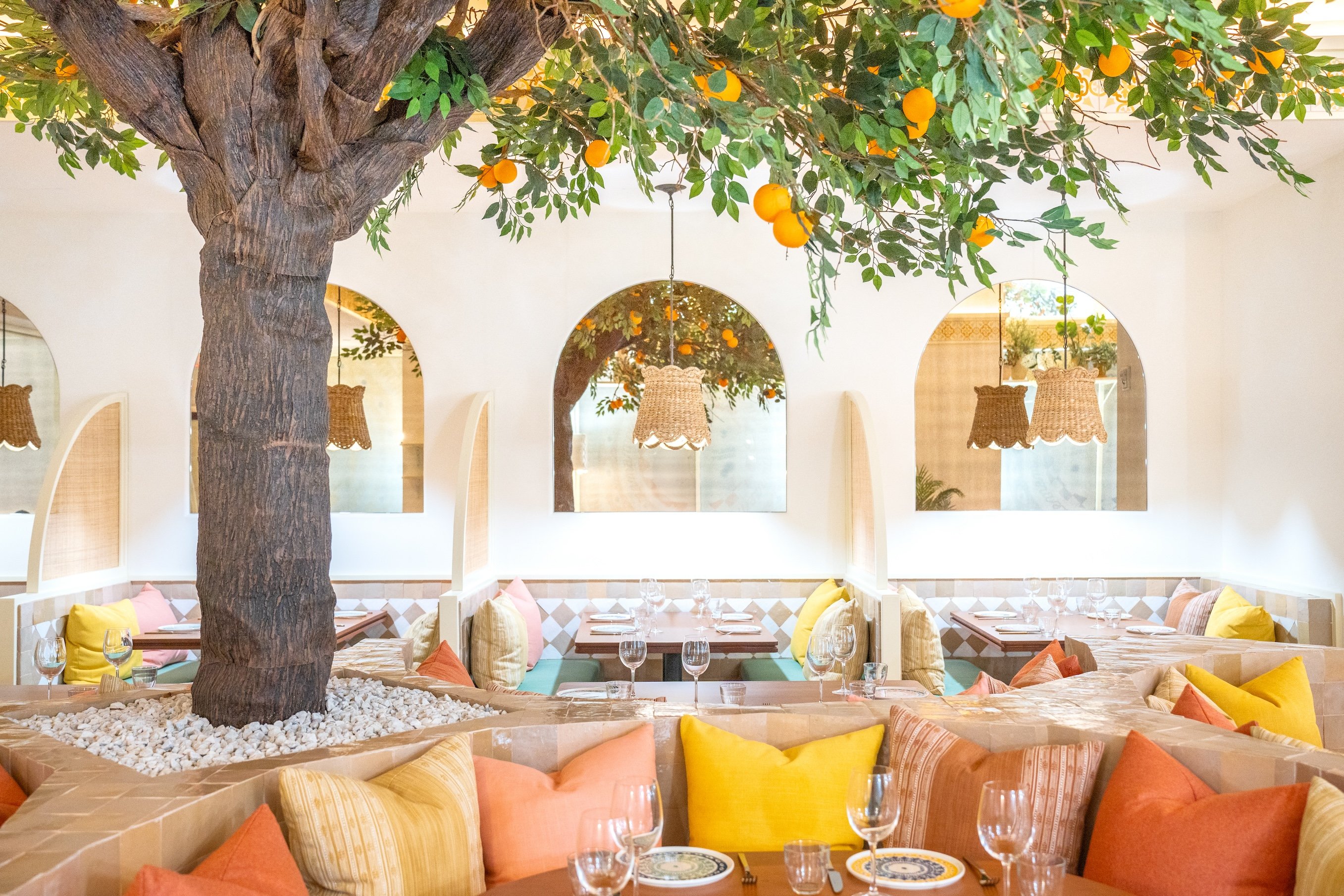Inside, sunlight pours through floor-to-ceiling windows, illuminating an airy dining room anchored by an oversized citrus tree. Saturated hues—deep green, terracotta, and marigold—weave through the plaster walls, hand-painted tiles, and embroidered textiles, creating a palette that feels both earthy and elevated. Two lush patios with cascading greenery and floral installations extend the Mediterranean provenance outdoors.