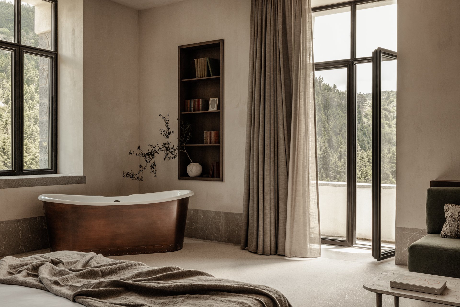 Manna’s 32 rooms and suites blend raw stone and soaring ceilings with bronze, velvet, and marble finishes. My suite had a soaking tub overlooking the fir forest, just begging me to indulge every evening. Thoughtful personal touches included shelves lined with novels such as Zorba the Greek by Nikos Kazantzakis in both Greek and English, and Greek herbal teas from Symbeeosis, which I loved sipping on my stone balcony as the sun slipped behind the mountains. Couples will love the suites, and note that children above the age of 11 are welcome, so whilst it’s not necessarily ideal for families with young children, it makes for a beautiful, quiet, peaceful retreat.