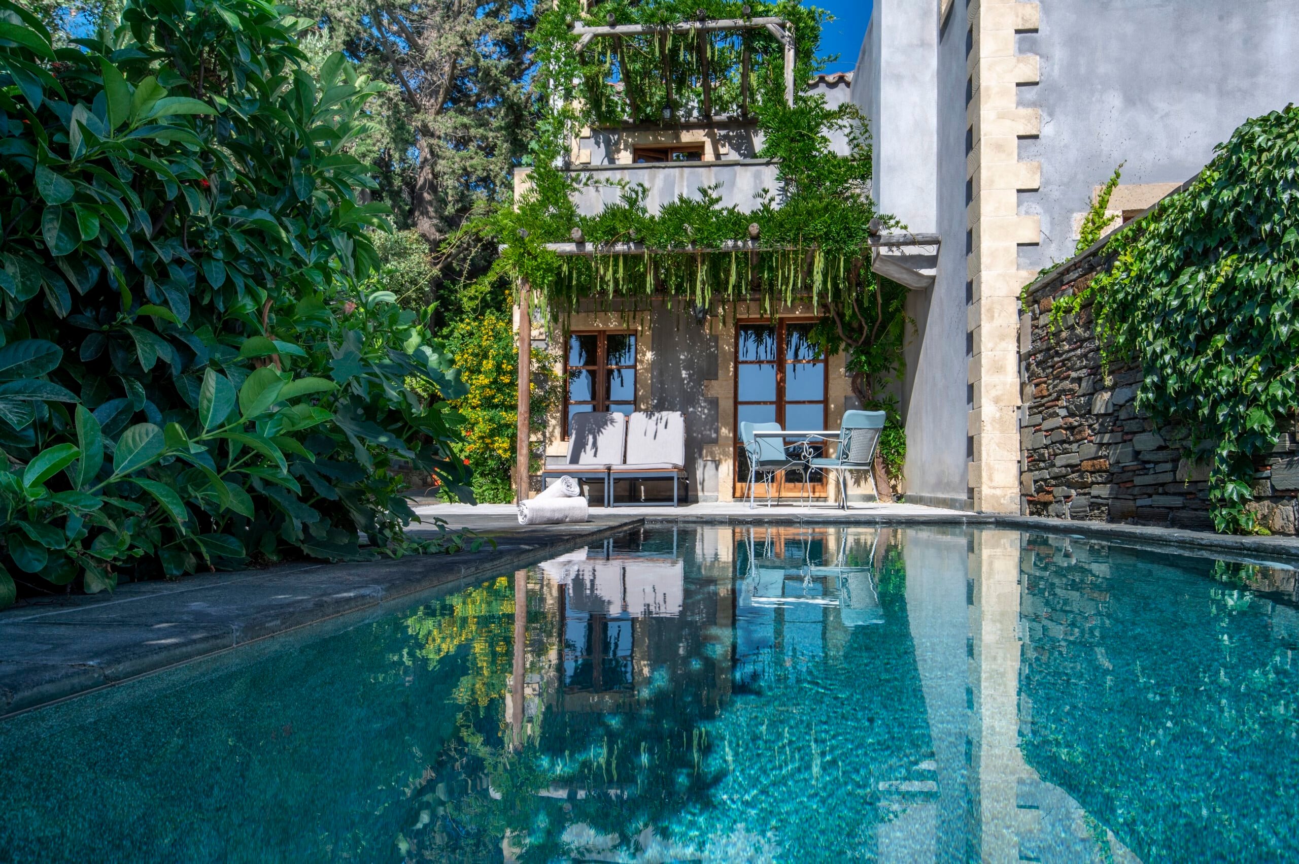 This enchanting Byzantine-era mansion is a storybook retreat, nestled among olive groves, vineyards, and citrus trees. With 52 rooms total, including 19 suites and one villa, each accommodation features unique architecture and luxurious simplicity. Think handmade tapestry, embossed headboards, marble bathrooms, top-quality linens, impressive wooden ceilings, and the balance of vintage and modern decor. Kinsterna Hotel takes farm to table on new levels. Oil, wines, marmalades, and produce are all local and stars of the dishes served.