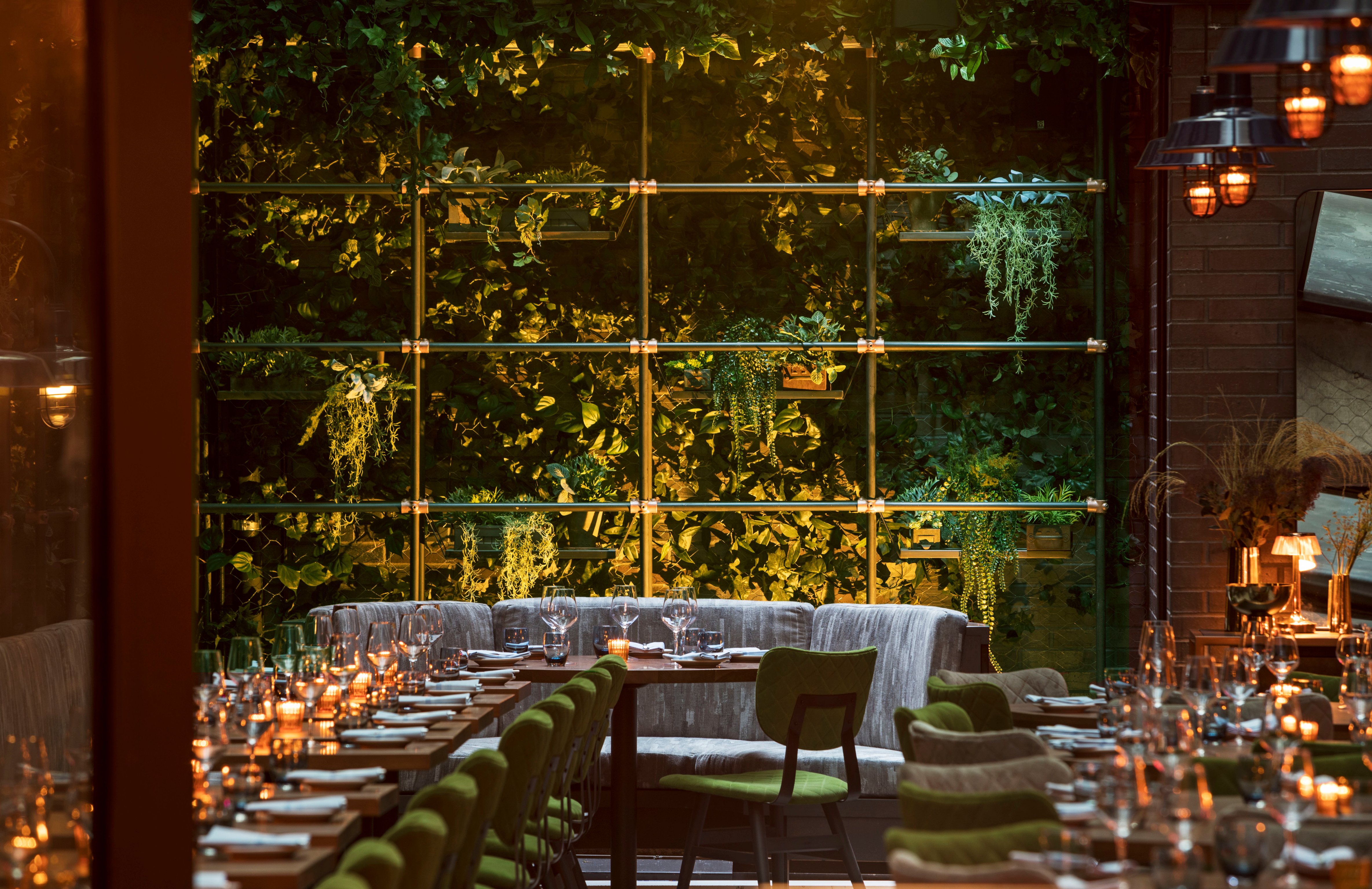 If there’s a single reason to book a table while staying at the Moxy East Village, it’s Cathédrale. Down a staircase that feels equal parts fire escape and secret passage, you enter a soaring dining room crowned by Fillmore—artist Edoardo Tresoldi’s ghostly wire-mesh dome paying tribute to the legendary Fillmore East concert hall. Concrete walls layered with neon signs and vintage concert posters nod to the neighborhood’s rock-and-roll past, while a moody central bar anchors the room.