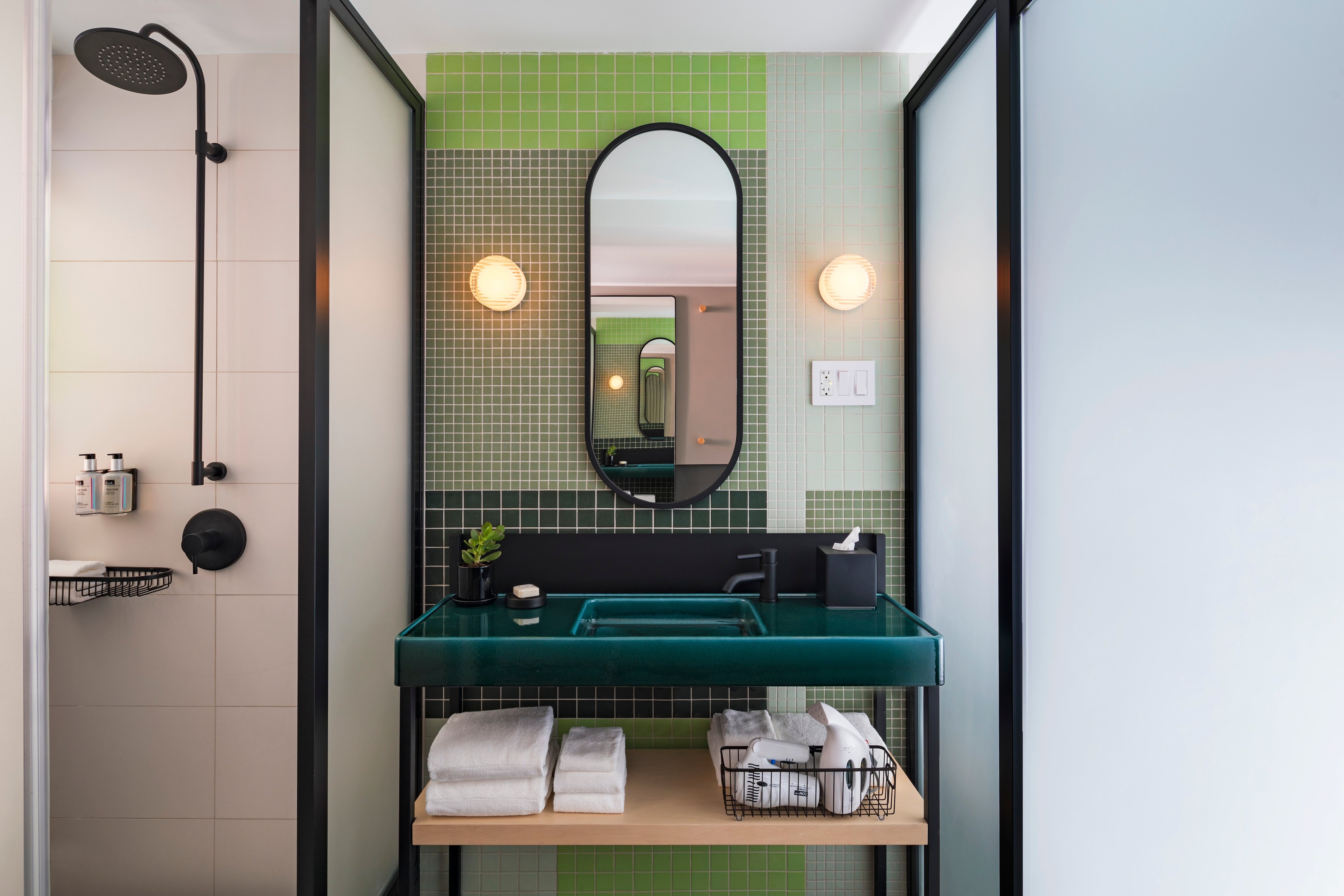 Rockwell Group designed the 13-story hotel as a “vertical timeline” of East Village history—from immigrant roots to CBGB punk to the scene today. Expect graffiti-striped carpets, vintage concert posters, and raw concrete layered with neon and wood. Check-in happens at repurposed desks under shredded-poster tapestries, while the lobby’s Alphabet Bar Cafe feels like an East Villager’s living room: swing chairs, VHS tapes, and a backyard terrace with tumbling greenery. It’s gritty-meets-fun, true to the neighborhood’s DNA.
