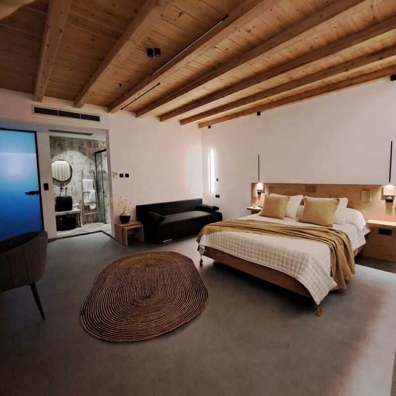 Comprising only 42 rooms and two suites, the waterside oasis touts unobstructed views of the Aegean Sea, as well as the ships that barrel in and out of it. Accommodations are recently renovated with warm, industrial-like accents such as wood-beam ceilings, burlap-style rugs, as well as stone-embossed, walk-in showers. While a boutique style is part of its overall look and feel, the decor captures the luxury and comfort of a five-star hotel.