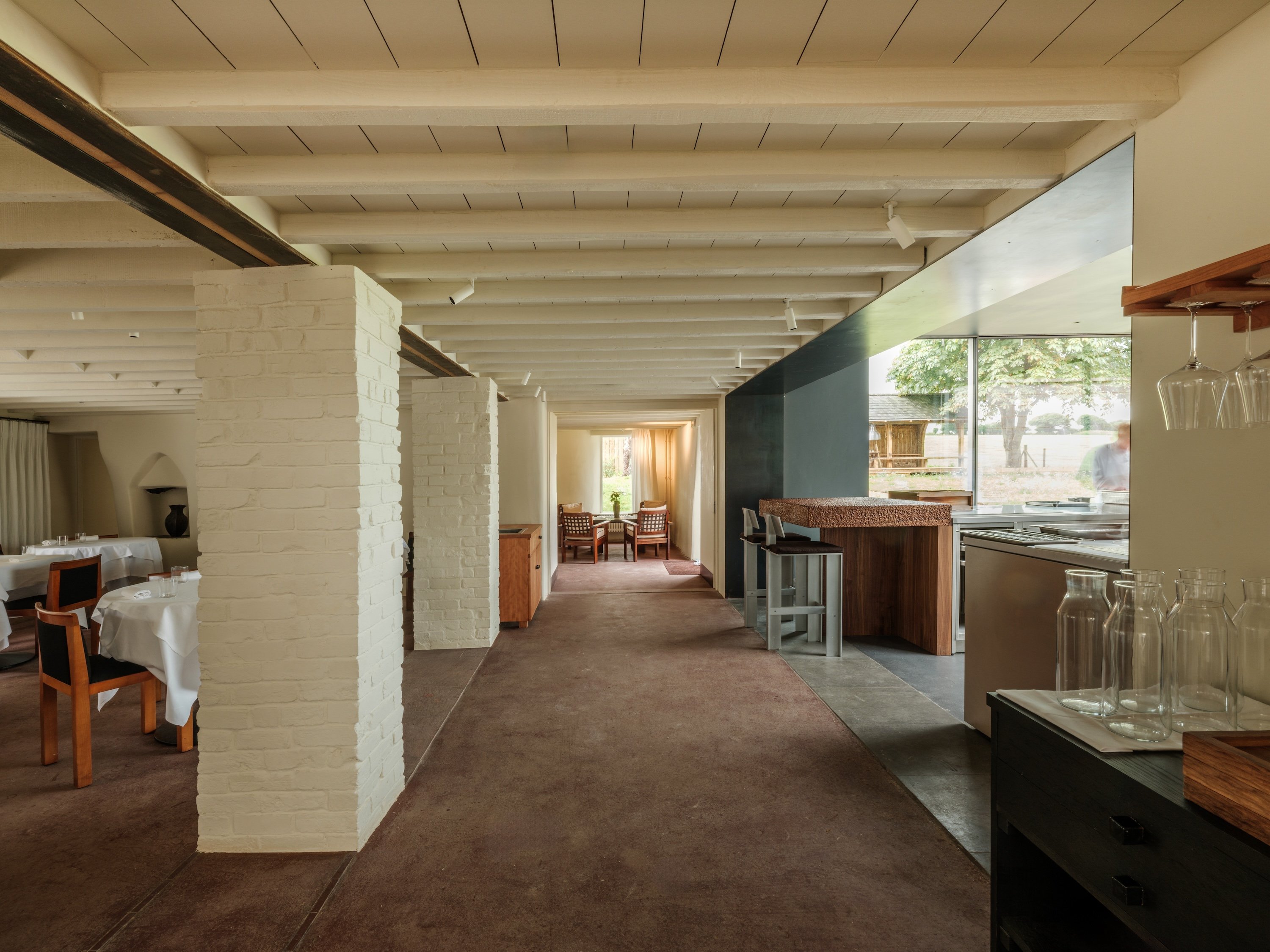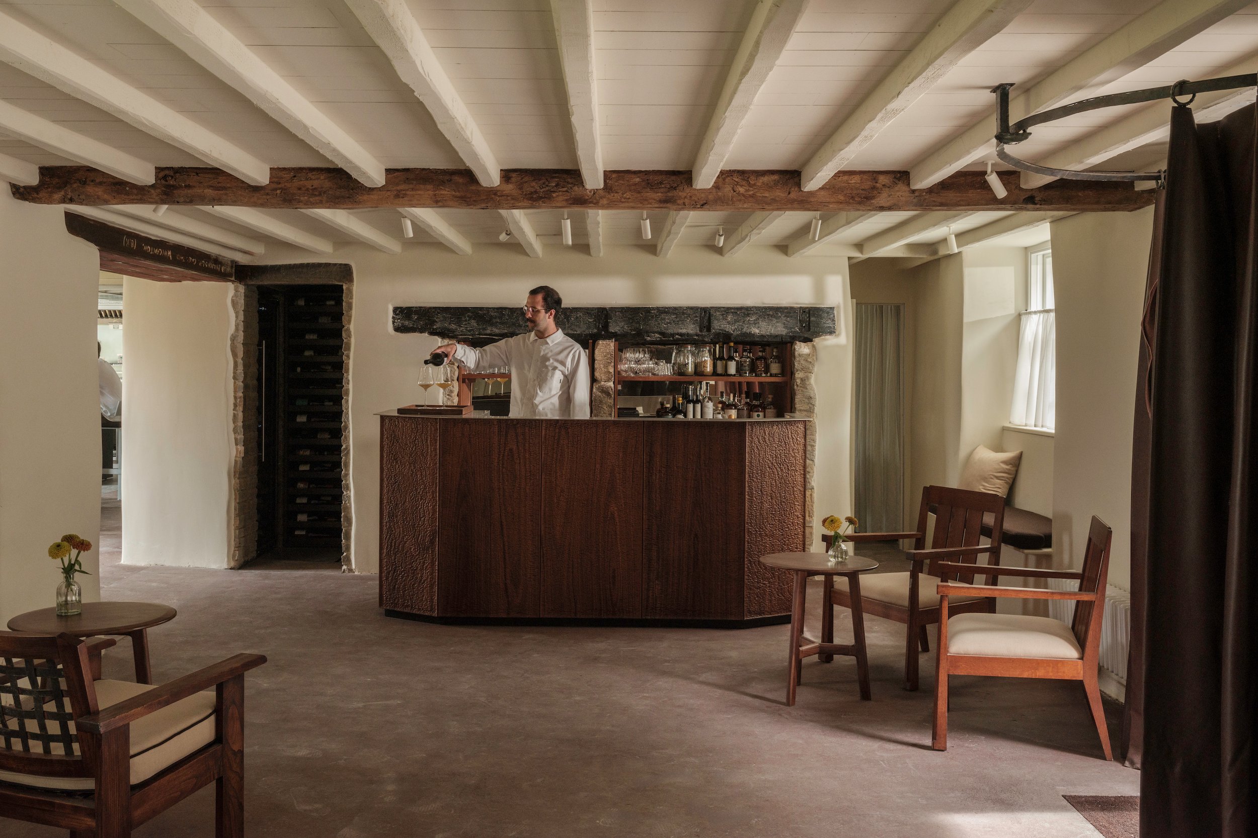 In 2024, Osip relocated from central Bruton to the adjacent countryside, setting itself up in a former coaching inn where travelers used to find respite on the way to and from London. Alongside the contemporary British restaurant, Labron-Johnson envisioned several comfortable bedrooms on the upper floor. He enlisted designer Johnny Smith for the renovation, which created airy, minimalistic spaces that span two stories. The design connects to the downstairs lounge and dining room, which are adorned with local artwork and custom pieces, including a leather door curtain that was made especially for Osip. The color palette is muted and serene, creating a relaxed but still upscale atmosphere. During warmer months, there’s an outdoor space behind the kitchen, and guests can request to visit one of the restaurant’s nearby farms.