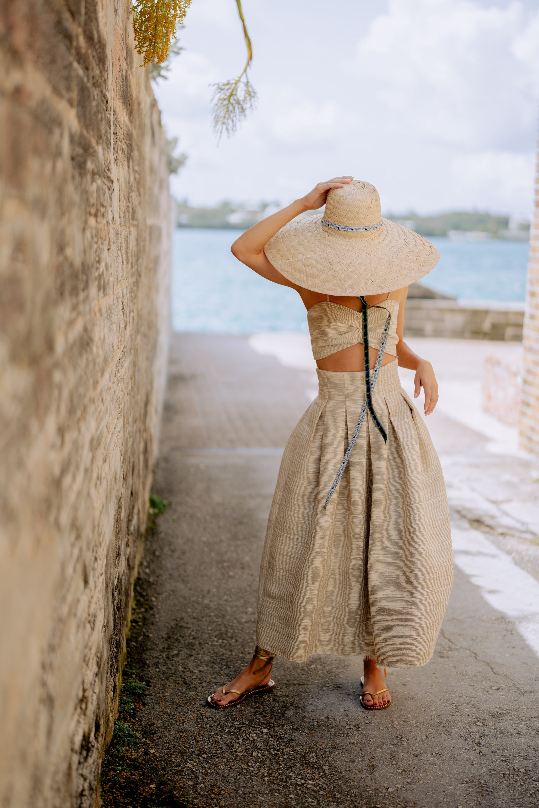 “My new favorite sun hat is the Hollyhock Sun Hat. It’s so boho and cool, and it has the brim of my best-selling style, the Wildflower, which completely protects your face from the sun yet still makes you look chic. The Hollyhock has this look, but it has the lifeguard, surfer-esque top that’s more bohemian. All my hats are designed with ribbons that customers can switch out. They’re equipped with brass grommets, so you can quickly slip the ribbons in and out. Bermuda is really windy, so you need a hat that can tie onto your head.”