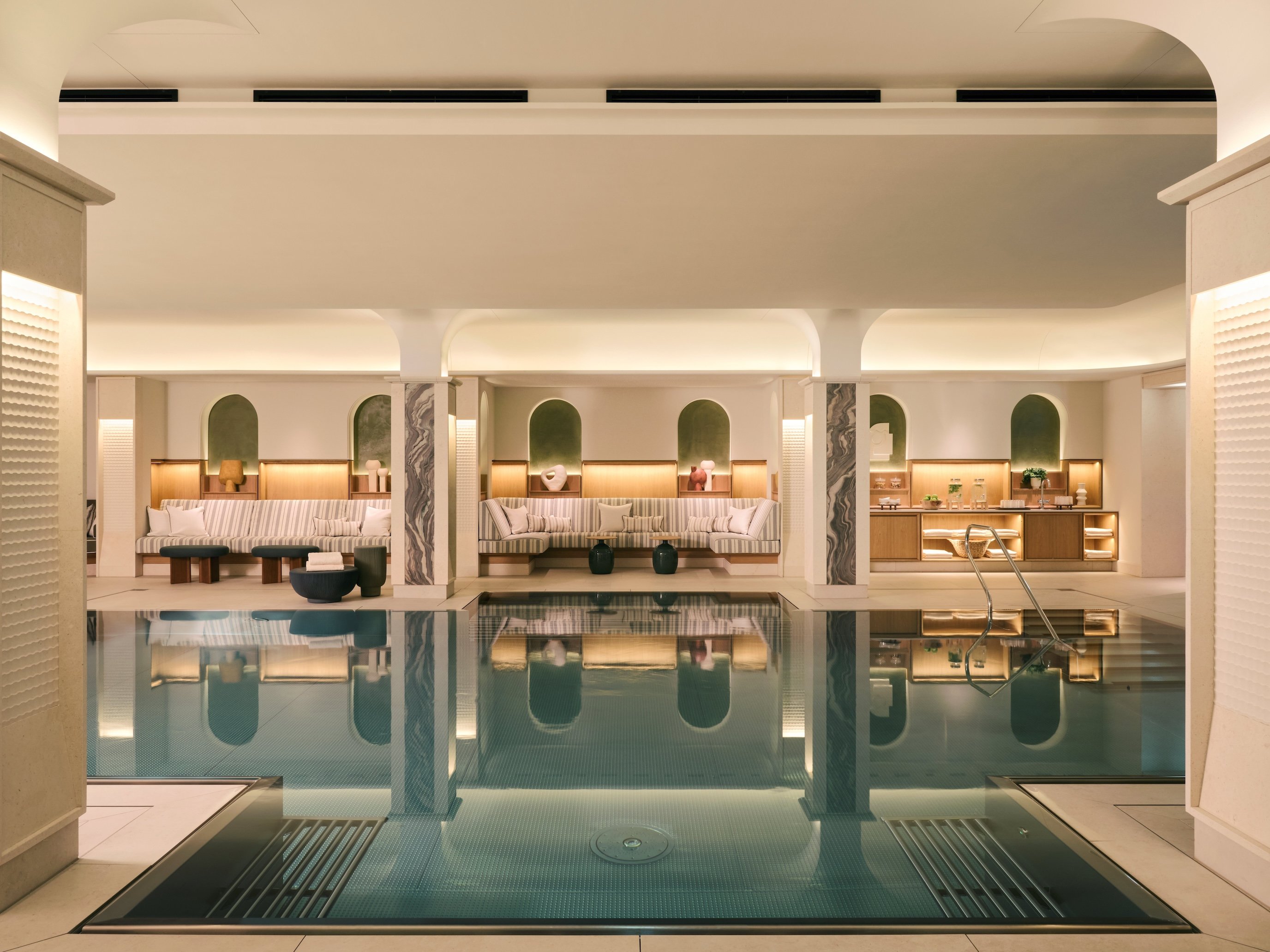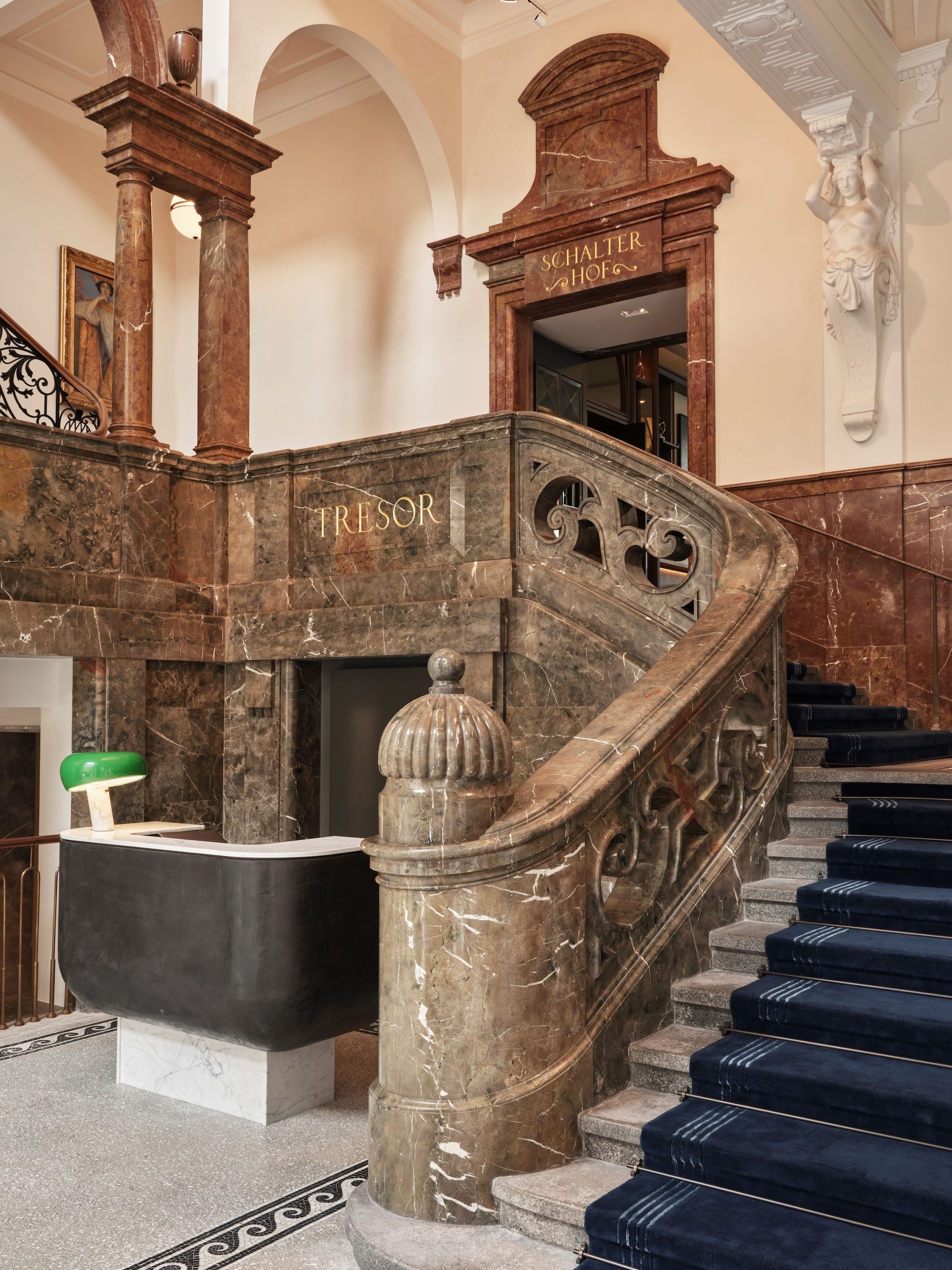 Its facade, central courtyard, and treasures throughout were masterfully renovated, ranging from a grand marble staircase to preserved frescoes. The restoration masterfully merges the historical significance of the two buildings with the modern furniture, color scheme, and room designs of the brand’s debut German property.