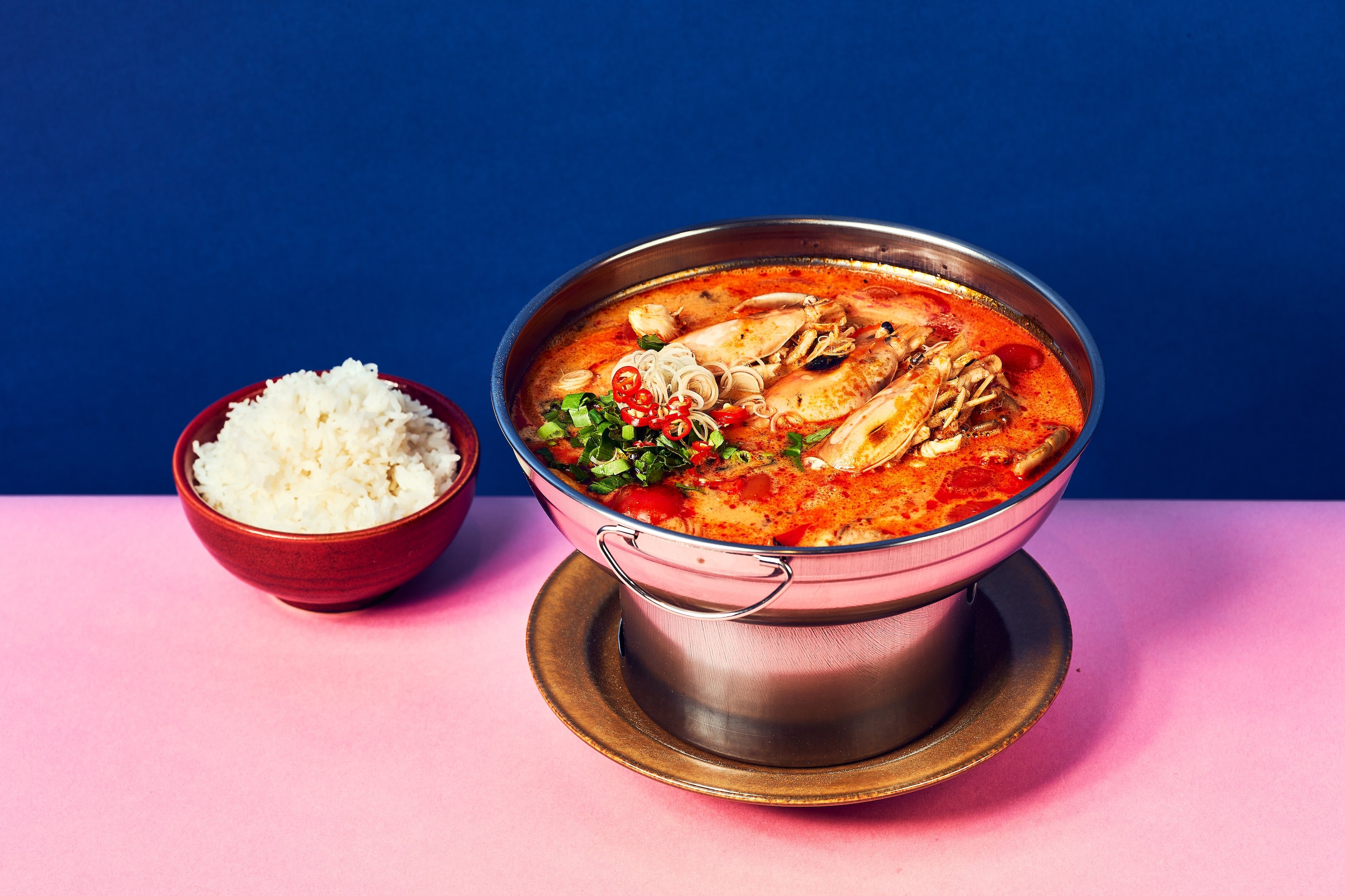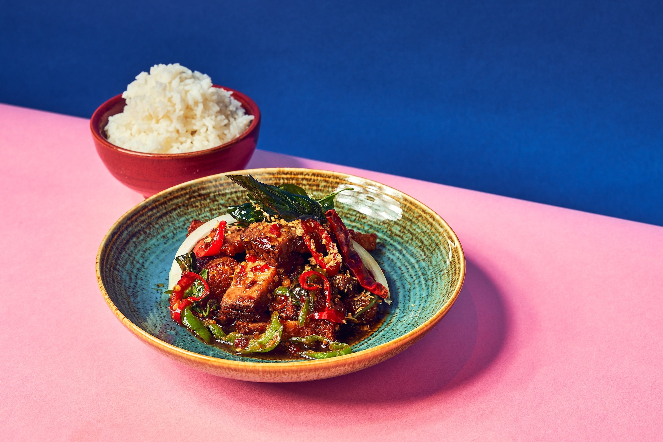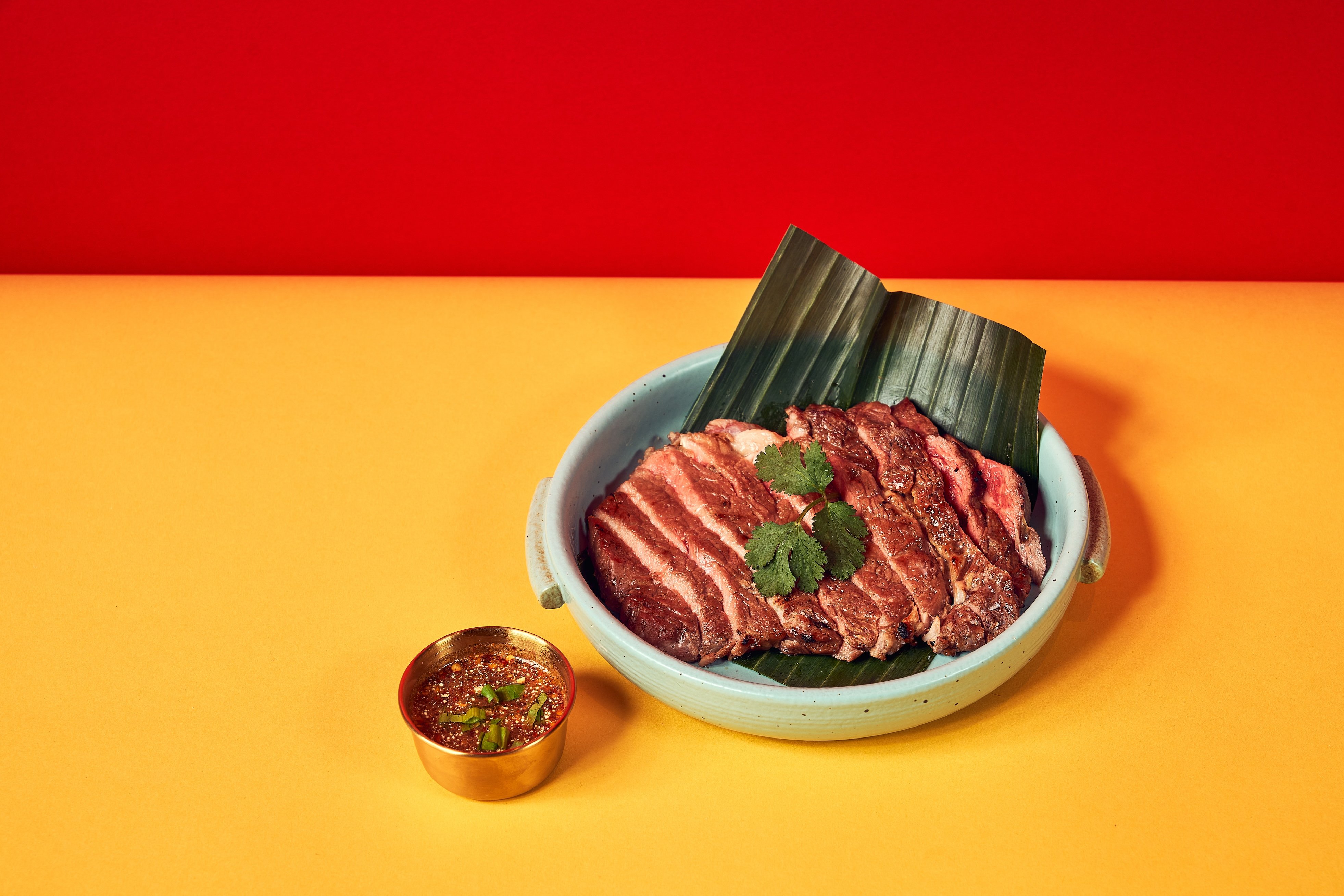 The Esan-style plates highlight the unique flavors of Thailand’s Northeast locale. Essential Esan fare includes Sappe Ribs, grilled marinated pork spare ribs; Pla-Ra, a spicy green papaya salad with crab and anchovy, and Sok Lek Kua, a robust beef blood salad with herbs. Tom Yum Tiger Prawn hotpot–a spicy and sour soup with tiger prawns, mushrooms, and Thai herbs–and raw delights like Goi Nuer (beef tartare) showcase the region's bold flavors.