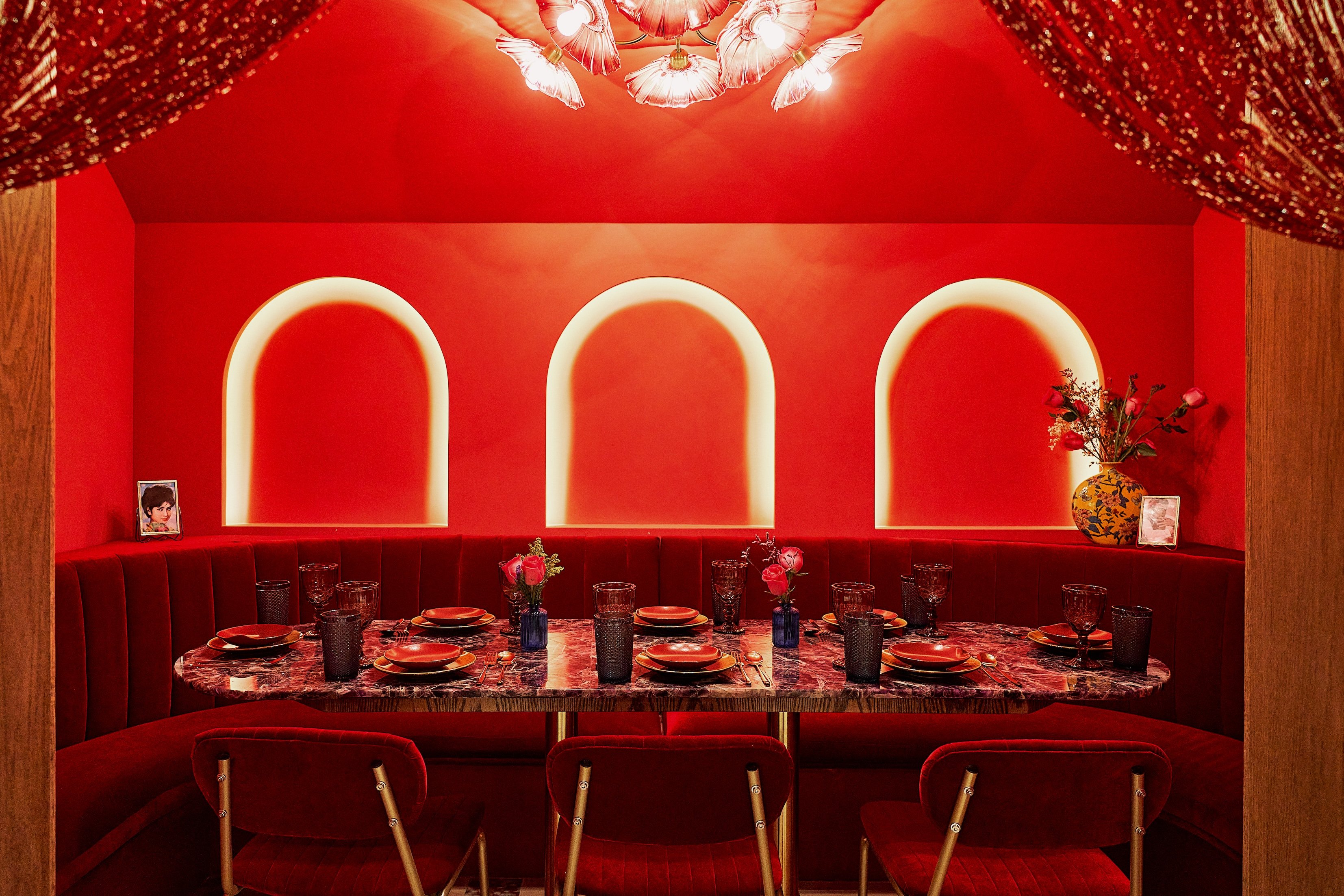 The design reflects this vibrant theme, combining vintage Bangkok glamour with conventional Thai materials. Guests are welcomed by a striking portrait of Jae Hwee, the restaurant’s muse, and can admire the colorful Thai stained glass windows, a sumptuous Breccia Scoppio marble bar, and neon lighting that evokes a lively atmosphere.