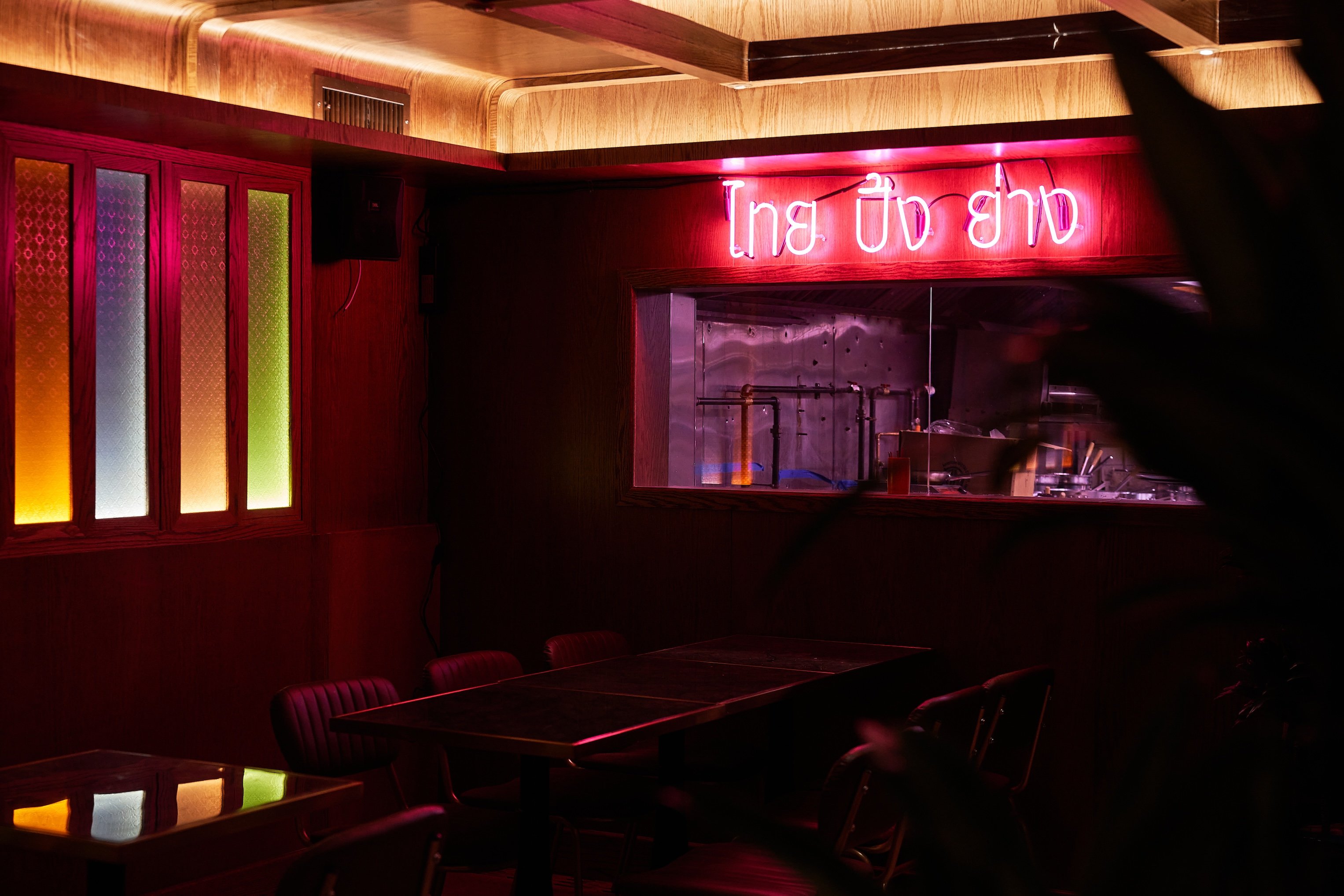 A plexiglass window provides a view into the bustling kitchen, while a transitional space adorned with Thai street signs and food carts adds an earnest touch.