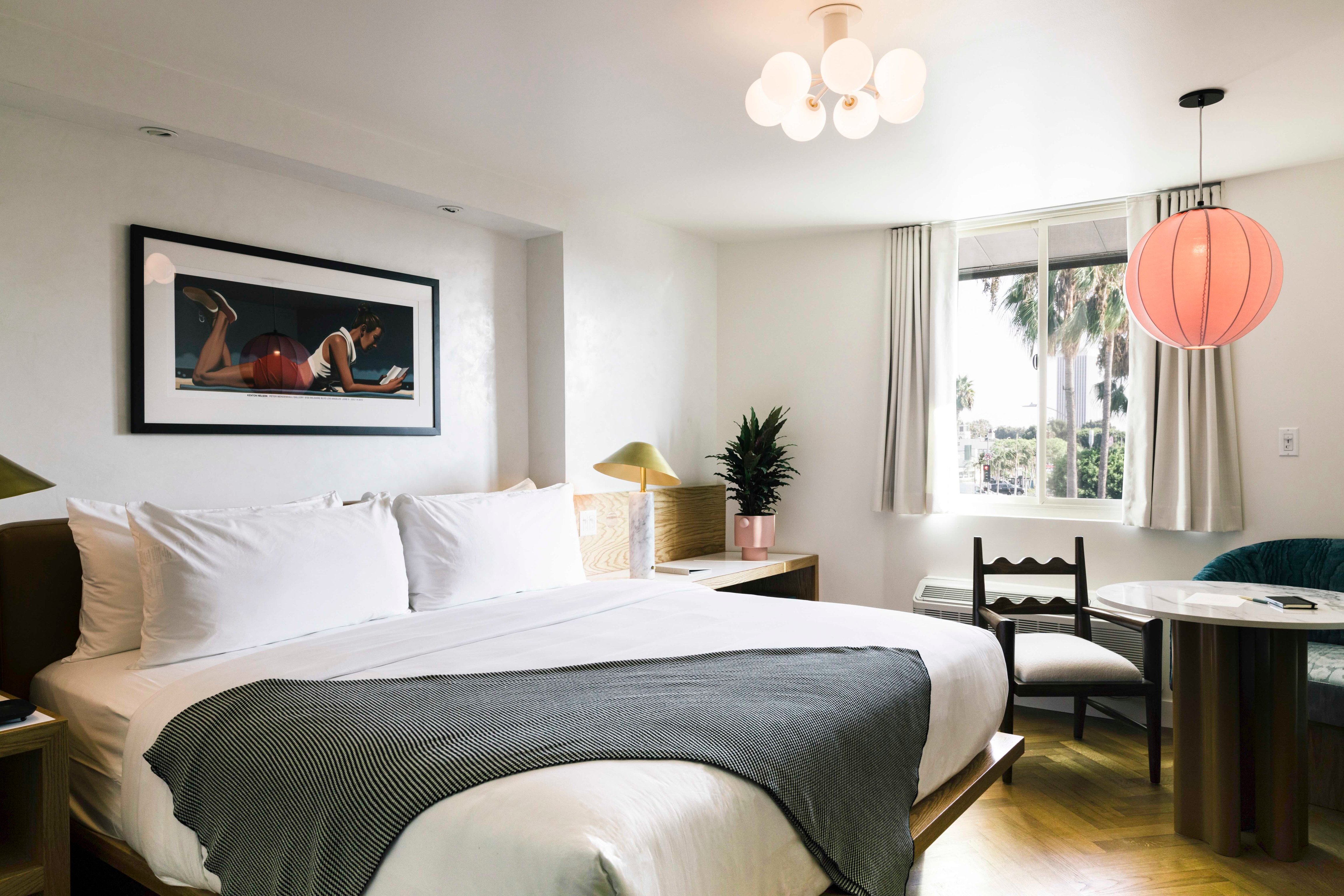 Expect beachy vibes and retro undertones across all 66 rooms and suites. Above the bed (or beds, if you opt for a Signature Double), chic artwork by Kenton Nelson pays homage to L.A.’s trend-setting nature, while a round armoire adds a soft femininity to the otherwise angular architecture of the space. In the bathrooms, framed vintage matches from Canter’s Deli offer a local touch, and custom Italian bath products line the shelves in the glass shower.