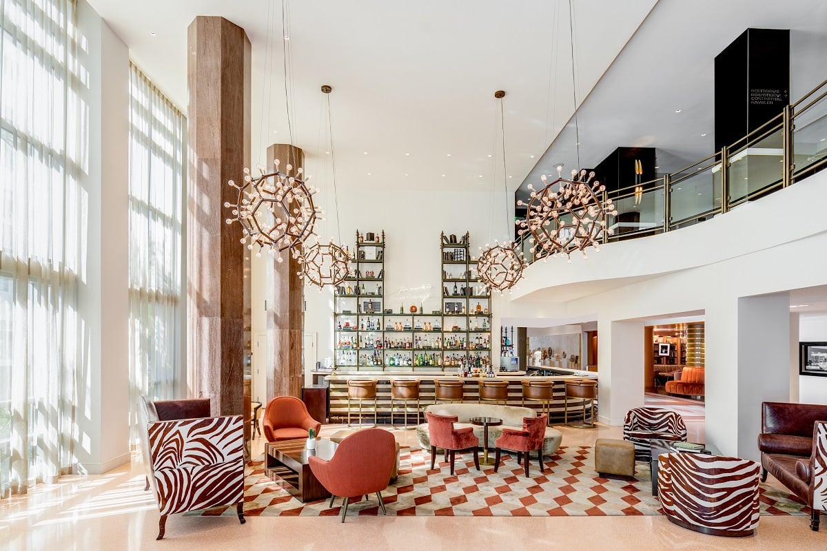 Dating back to the 1940s, Shelborne South Beach has long been an Art Deco gem in the heart of South Beach. Guestrooms and suites boast light blue and tan embellishments, with sweeping views of the Atlantic Ocean from the rooms’ expansive windows. When it’s time for tasty libations, The Drawing Room — the hotel’s sleek lobby lounge — nods to Shelborne’s mid-century past with its retro interiors.