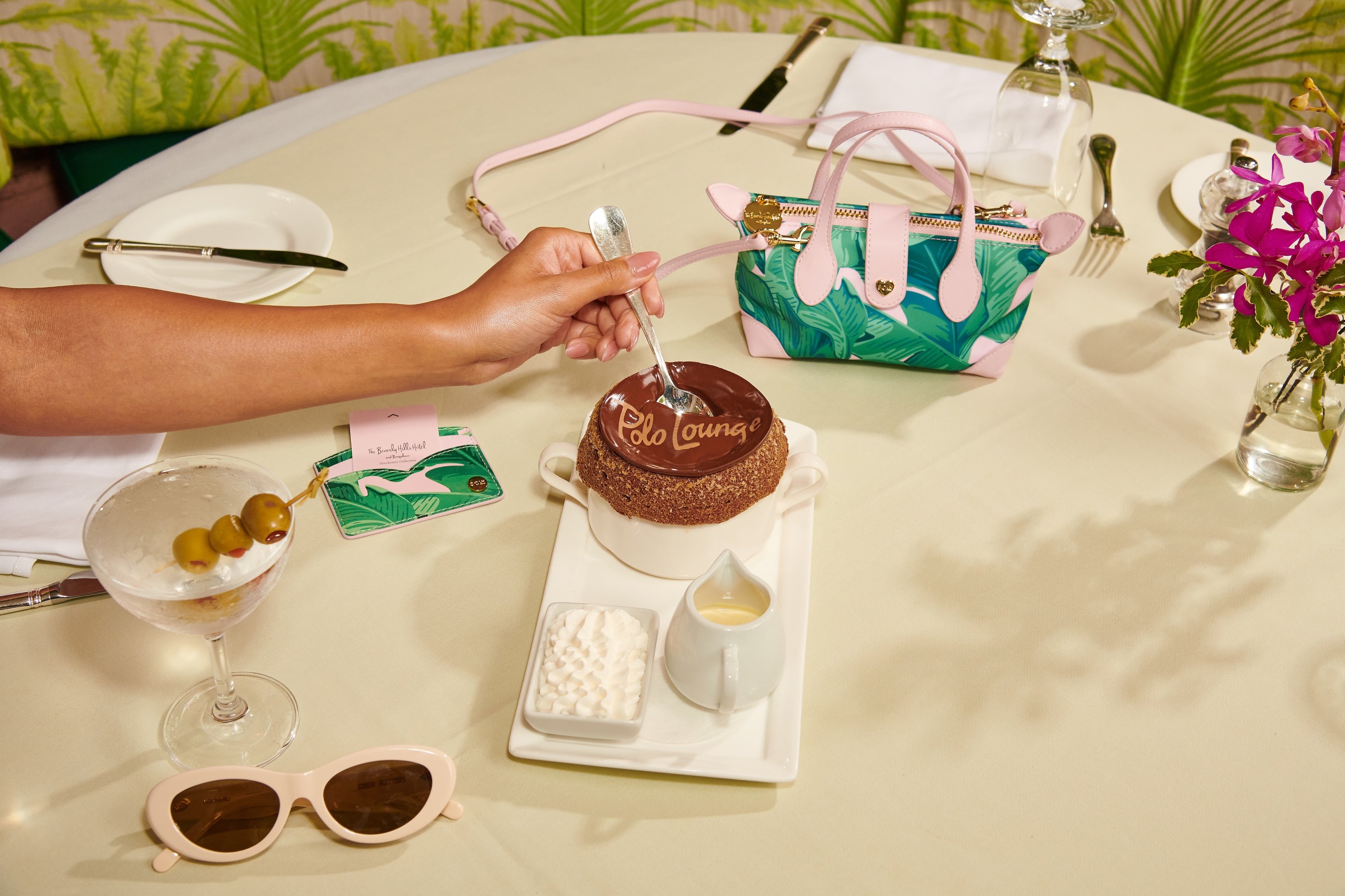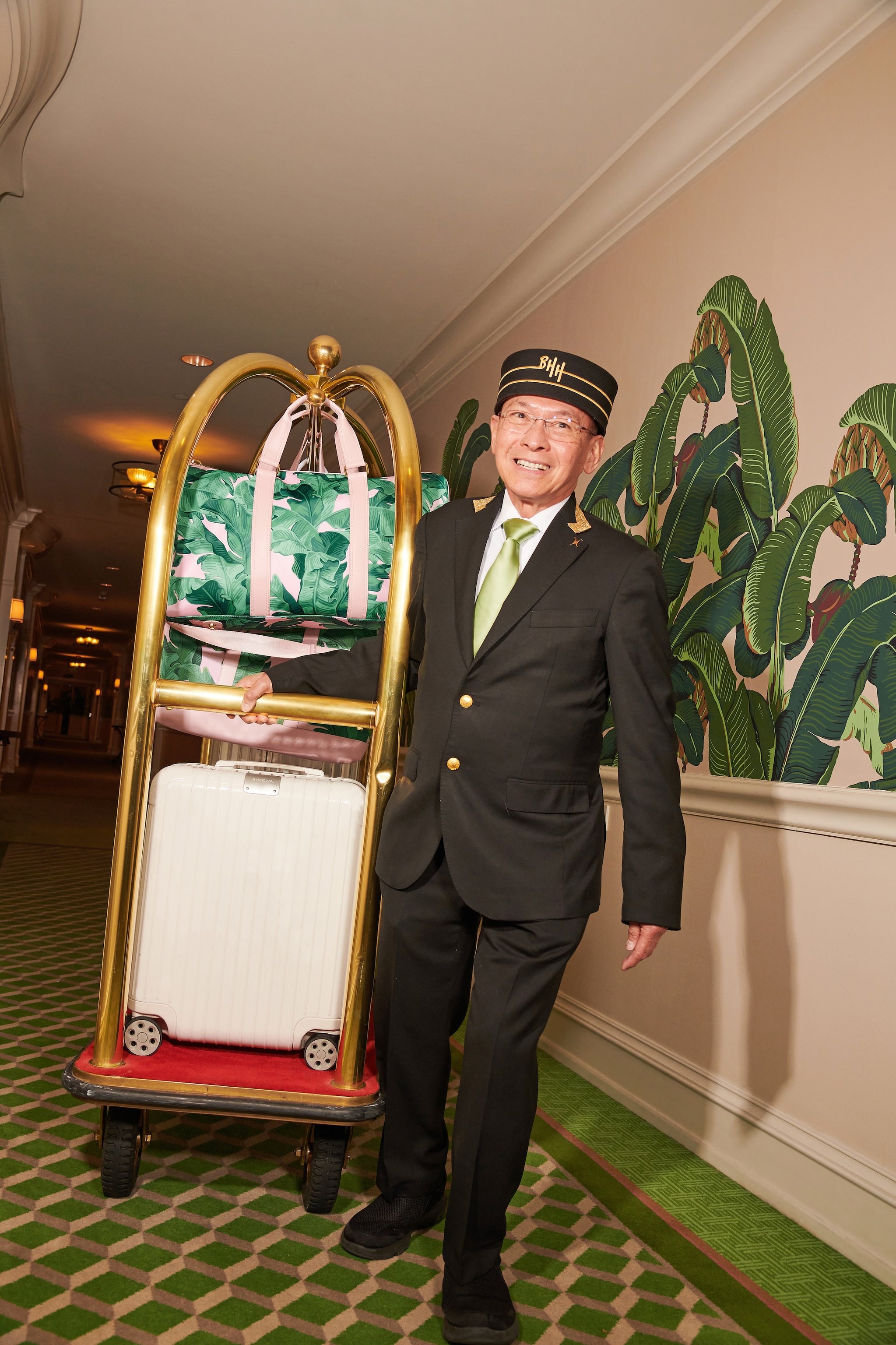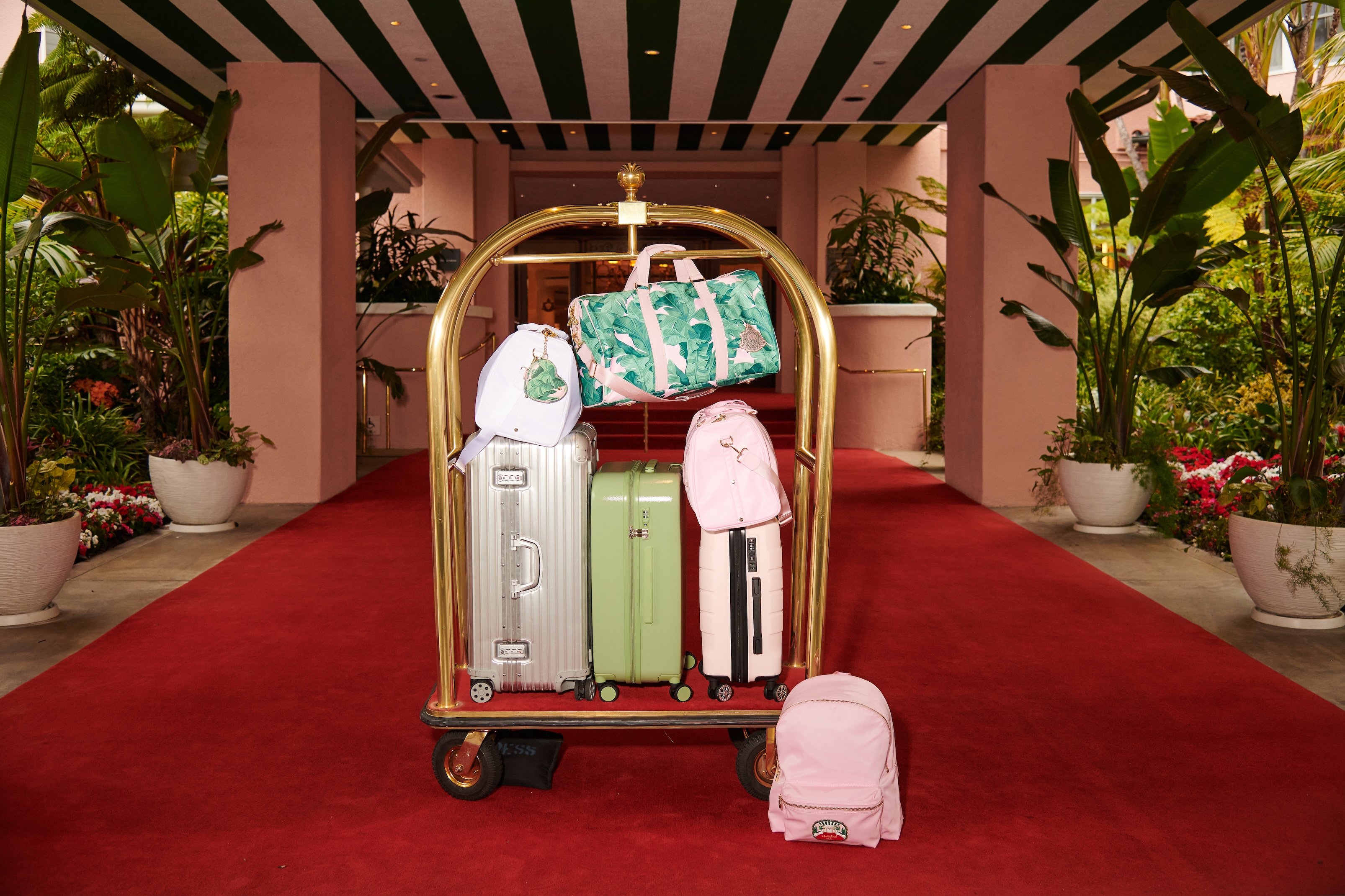 The stylish line features everything from oversized tote bags to mini pouches, all adorned with the hotel’s signature pink, classic green and white stripes, and eye-catching banana leaf motif.
