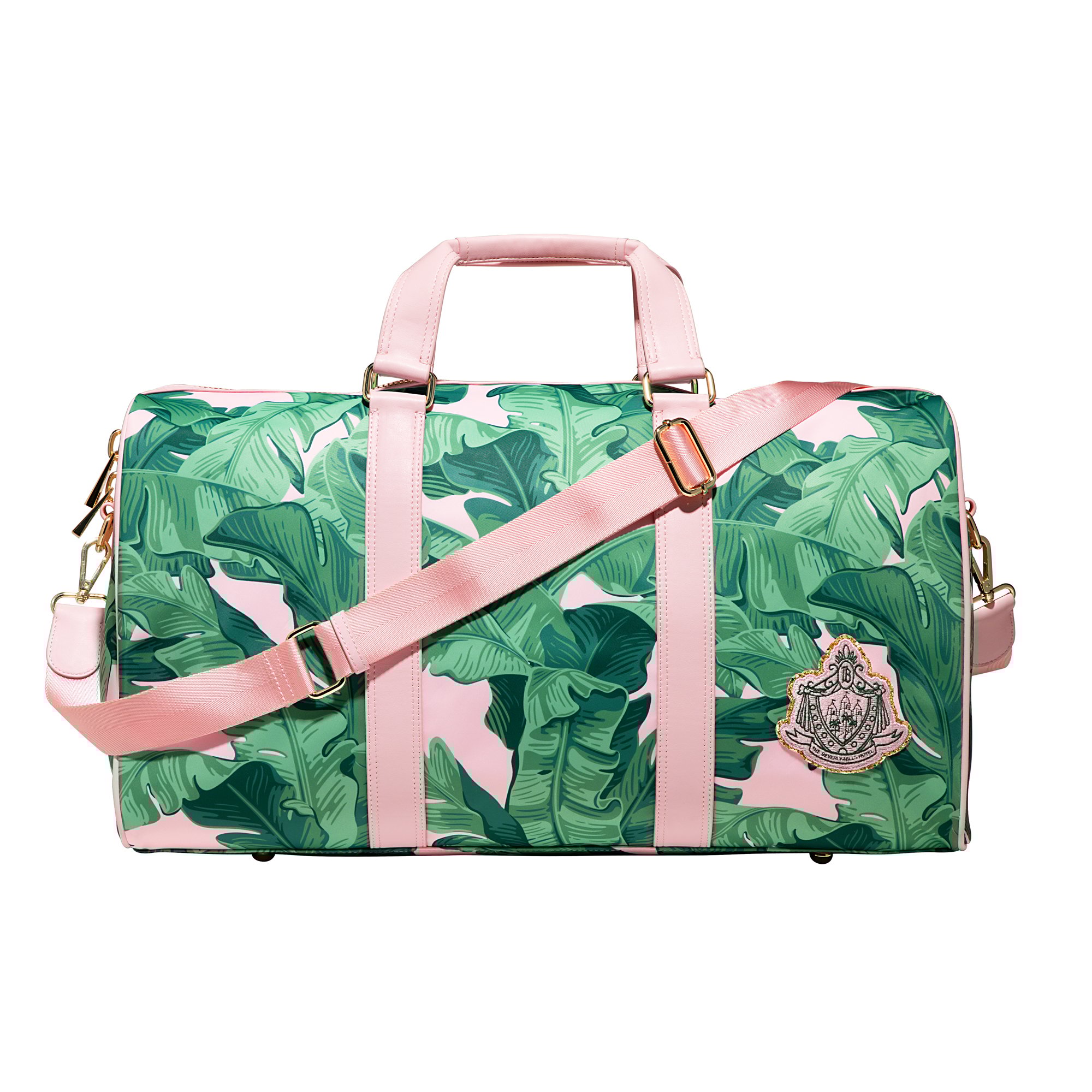 Among the standout pieces are two large tote bags – one in playful pink stripes and another showcasing the lush banana leaf pattern – and a spacious duffle bag and a weekender bag sporting the hotel crest.