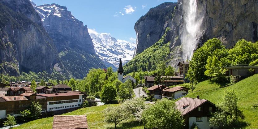 Trust us when we tell you that the town of Lauterbrunnen resembles a dream. Set in a valley surrounded by rocky cliffs and the massive, roaring Staubbach Falls, this place is as beautiful as they come. Staubbach Falls, which is essentially a majestic waterfall, cascades from a height of more than 980 feet, creating a postcard scene that’s almost too beautiful to believe. These falls, along with several other waterfalls in the area, give Lauterbrunnen its reputation as the "Valley of 72 Waterfalls.” And, due to these falls, people can hear the sound of cascading water from town. In addition to its waterfalls, Lauterbrunnen has little Swiss chalets as well as a food scene with regional specialties including dishes like fondue, raclette, and rösti.
