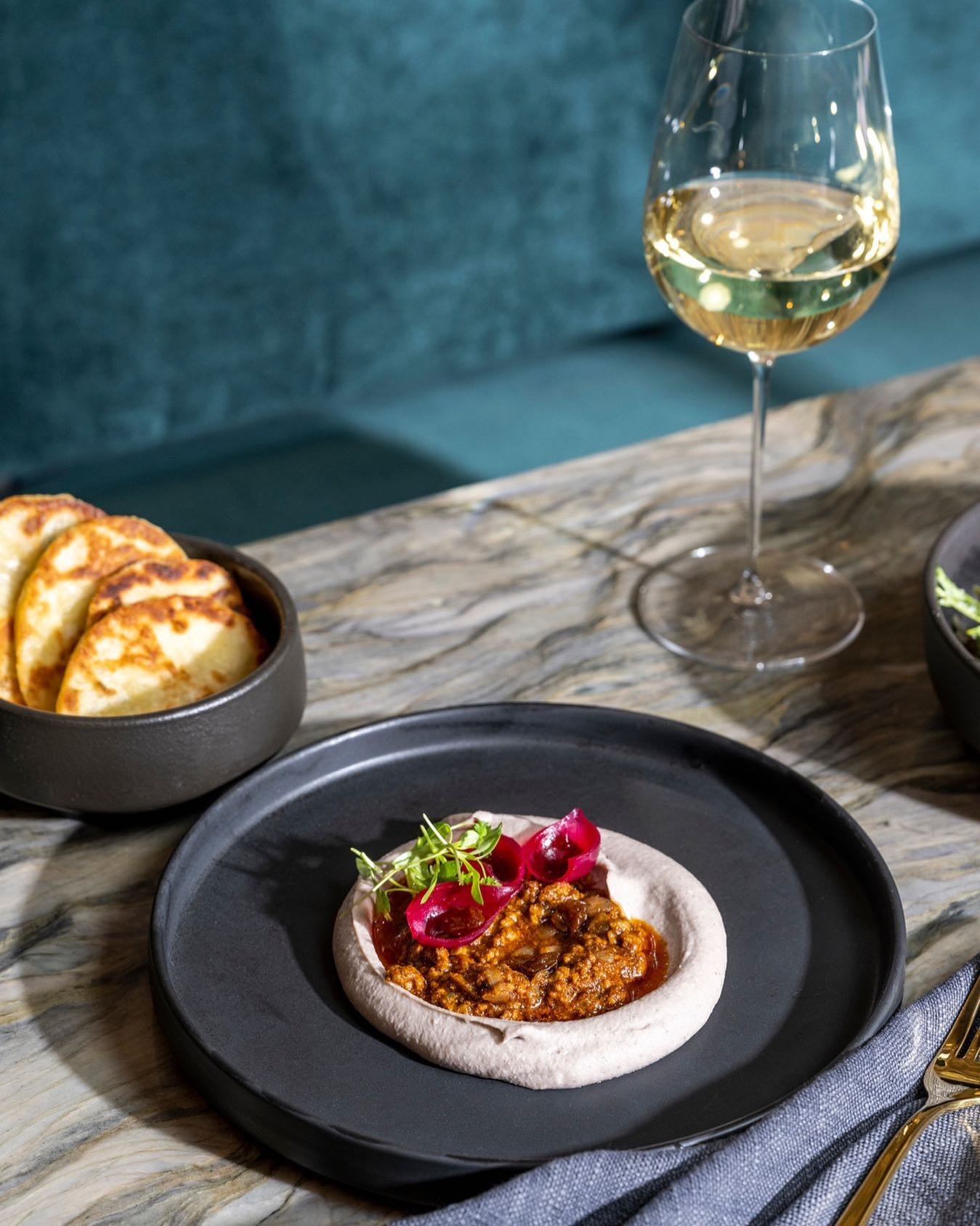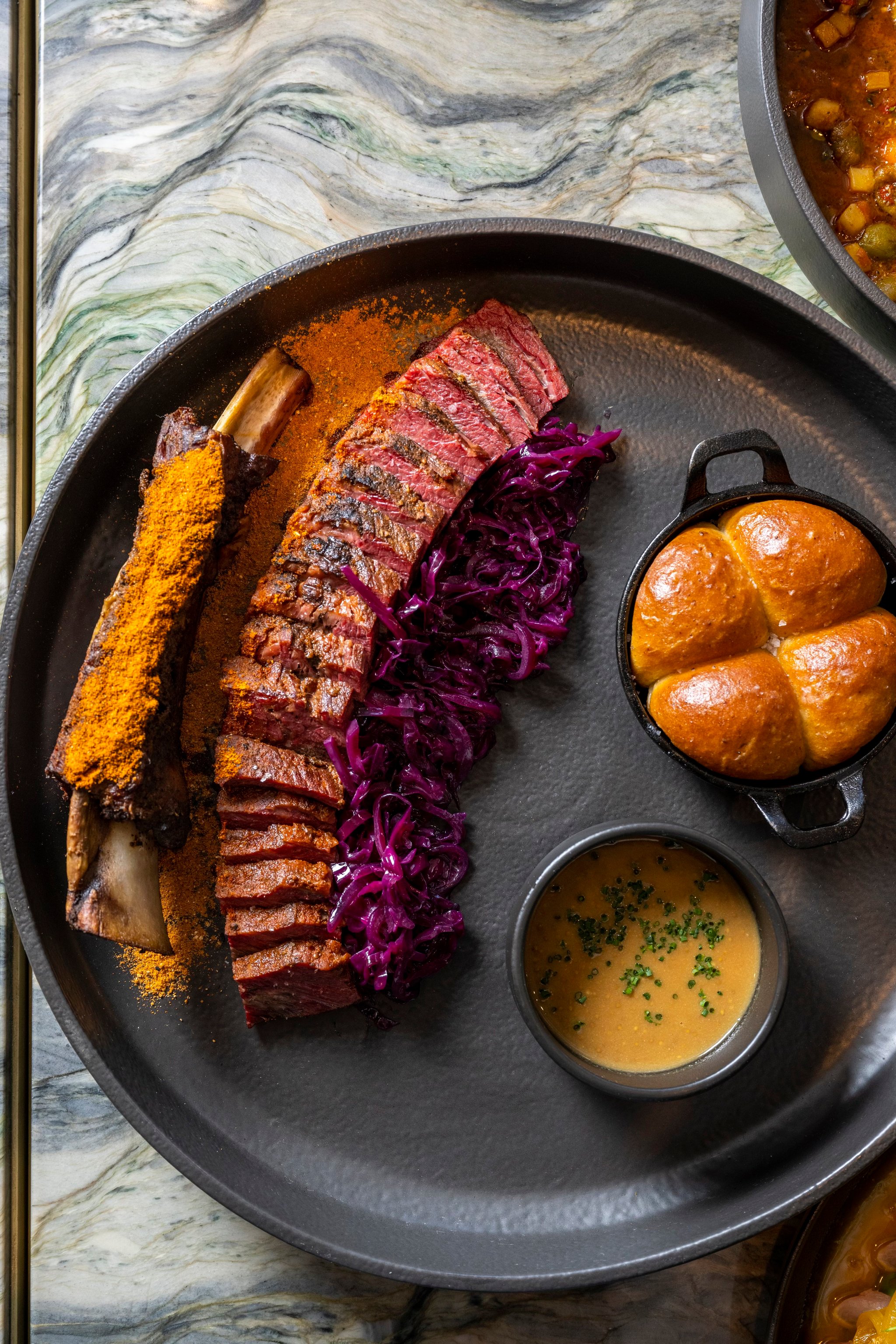 Braised Oxtails with rice and peas, Thumbelina carrot, and chayote carrot, are a hearty, comforting reminder of Chef Kwame’s roots, while the Short Rib Pastrami Suya combines wagyu short rib, caraway coco bread, and melted red cabbage for a bold take on a classic.