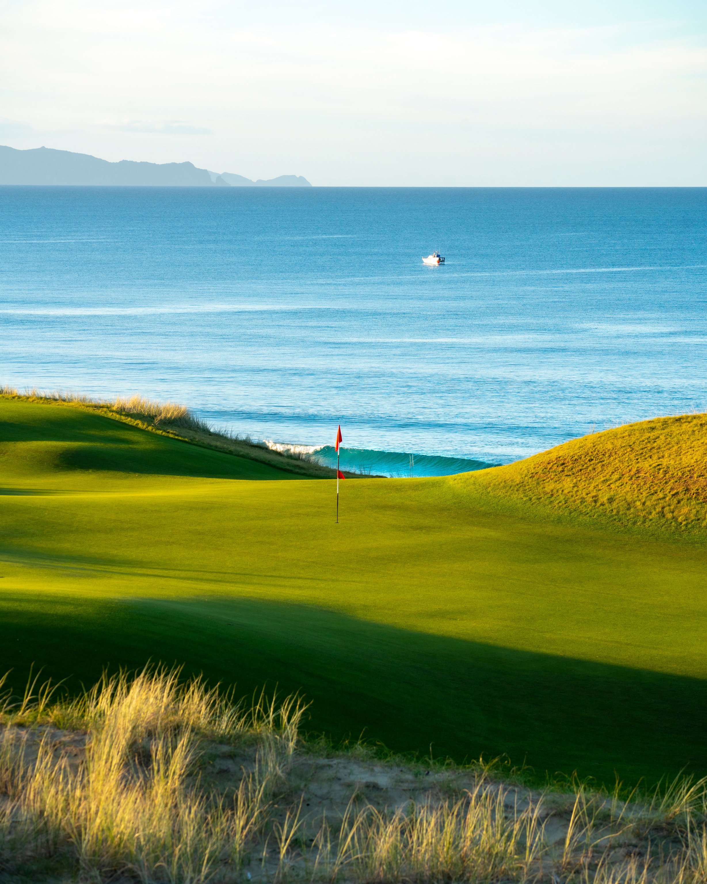 The drive north from Auckland feels like leaving one world for another. At first, you’re navigating suburban roads and the occasional traffic light, still close enough to the city to grab a last-minute coffee. Half an hour later, the streets have narrowed, and you’re passing fields scattered with sheep and cattle, their heads lifting lazily as you drive by. Then, almost without warning, the dunes appear. They rise and fall like sleeping giants, shielding what lies beyond from view. Somewhere behind them sits Te Arai Links—though you wouldn’t know it from the water.