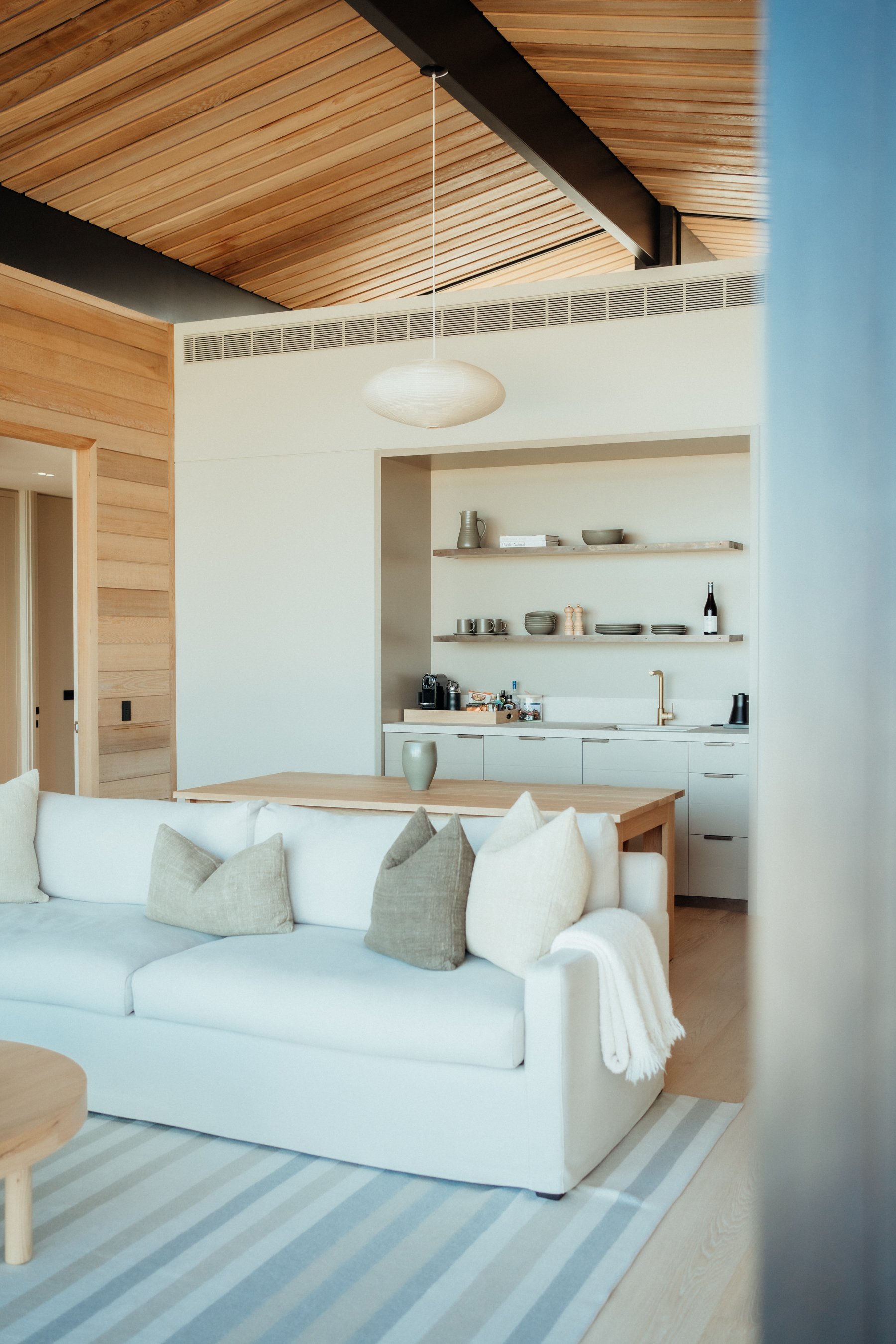 Inside, everything feels calm and deliberate. Kauri wood and weathered cedar add warmth, while pale stone and natural fabrics keep the spaces light and welcoming. The interiors don’t compete with the views—they frame them. Wide windows open to the ocean, so the focus is always on what’s outside. It’s a kind of design that feels effortless, though you quickly realize every detail has been chosen with care.