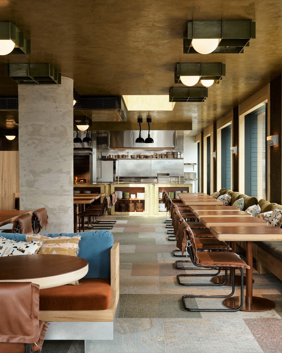 Fabulous views across Surry Hills, Central Station, and the city can be viewed from Klin, the rooftop restaurant inside the Ace Hotel Sydney. Earthy tones, a bar made from Australian stone, metallic touches, and custom hand-painted linen are a few details to look for in the space, which was designed by Fiona Lynch. Come a bit early to grab a cocktail and take in impeccable views.