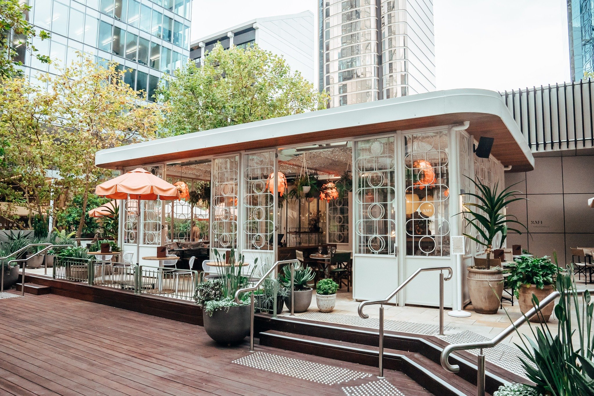 Sunny terraces, a chic cocktail bar, and a glasshouse structure are a few of Rafi's hallmarks. The 300-seat restaurant has a seafood-heavy menu paired with a playful, fun interior designed by Luchetti Krelle. Details like a custom-made geometric bar, floor-to-ceiling windows, striped banquettes on the outdoor terrace, and lush greenery are all around the space, so you can’t go wrong regardless of where you sit.