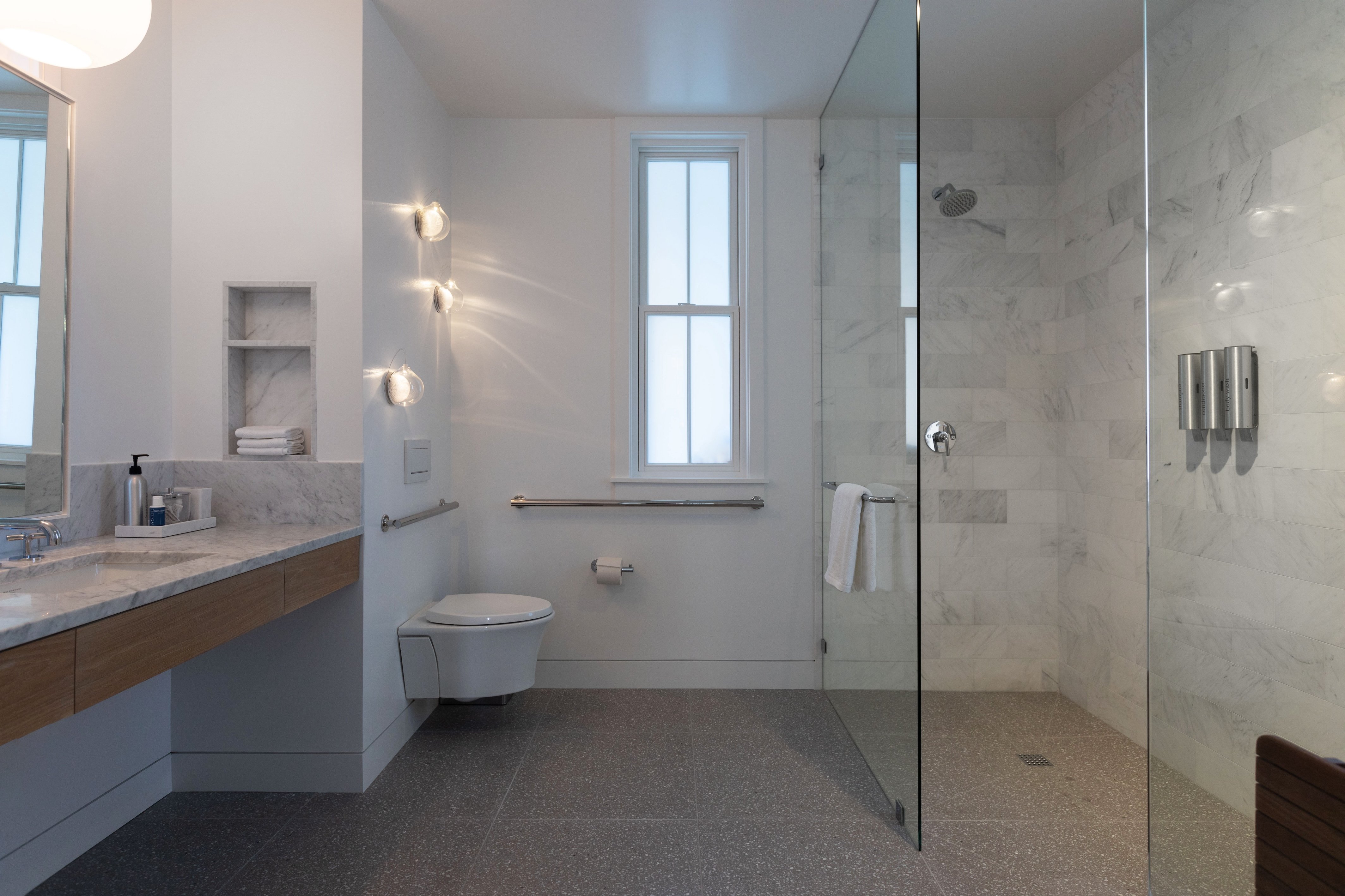 The sizable bathroom could almost be a cottage itself. Airy, pristine, and accented with veined stone and wood, the glass-lined double-head shower is a real stand-out—and a really rejuvenating place to rinse off the SPF and sand.
