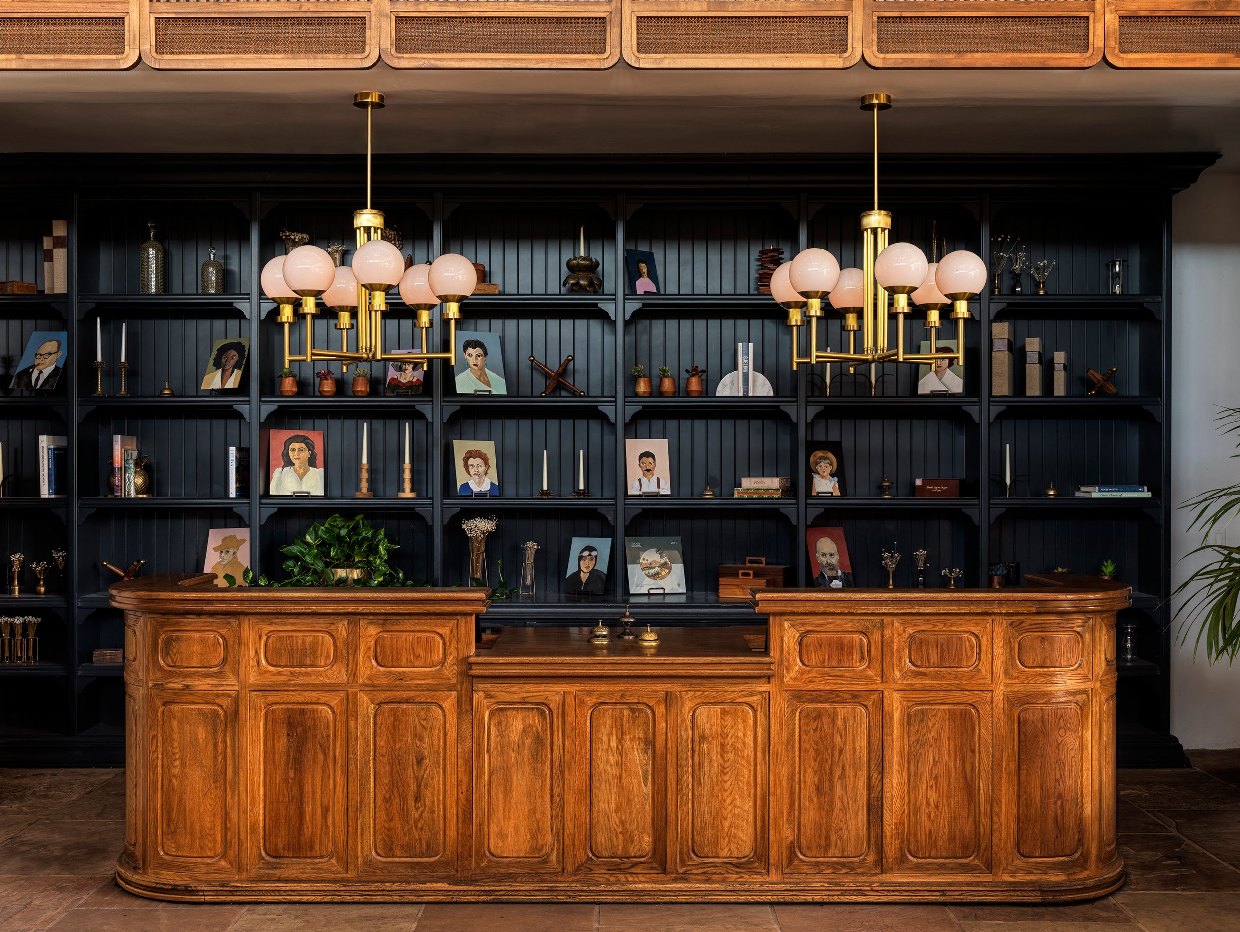 Driving up to the property in the heart of Old Town, a vintage 1965 Chevrolet Bel Air Convertible painted in teal blue catches the eye—echoing the timeless aura that awaits within its walls. The statement-piece front desk lies in the entryway corner: navy blue-hued recessed shelves adorned with mini portrait paintings, and charming home decor showcase the stay’s design-forward atmosphere.
