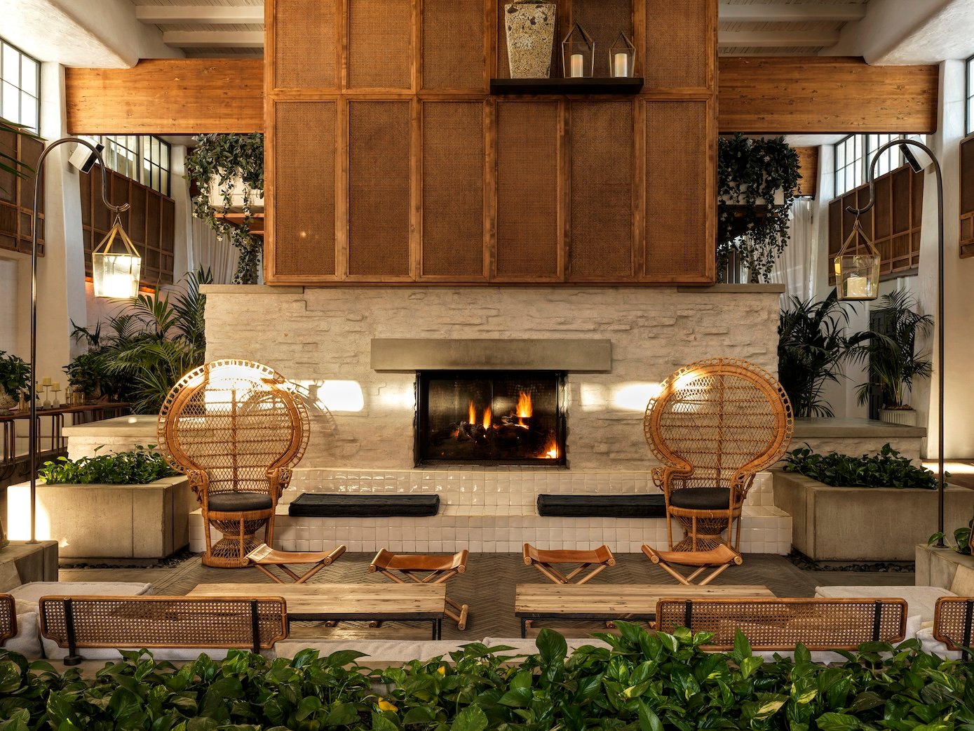 The indoor-outdoor grounds allow guests to saunter by The Scott's two glittering swimming pools, ensconced amidst verdant gardens, as they wander to their refurbished chambers. Private cabanas outfitted with posh day beds tease at the thought of soaking up Vitamin D and swimming in the pool as the primary activity during one’s entire trip. A cozy patio intrigues visitors to extend their sunlit days into the evening, offering warm fire pits and classic black-and-white films projected onto the wall.