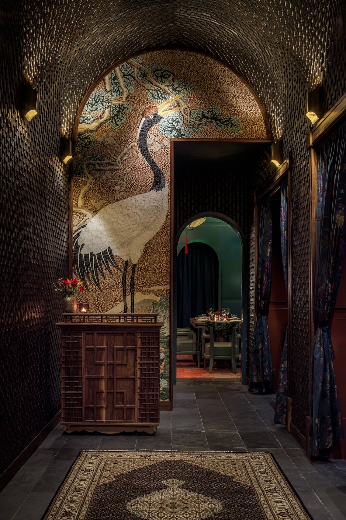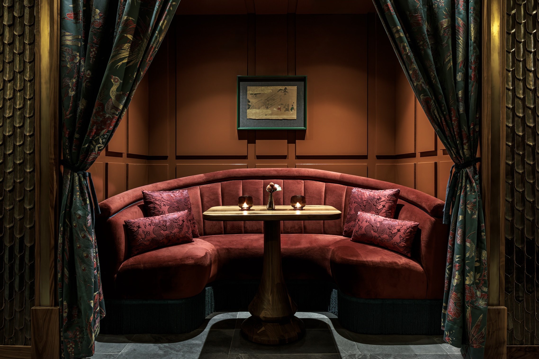 Inside, an intimate atmosphere and exquisite attention to detail await. Intricate, undulating wooden patterns echo traditional Japanese architecture, complemented by fabric pendant chandeliers and a bell adorned with Buddha faces. Sumptuous velvet seating in classic Oriental patterns invites guests to relax while the luxurious marble sake and sushi bar beckons with inviting wooden stools.