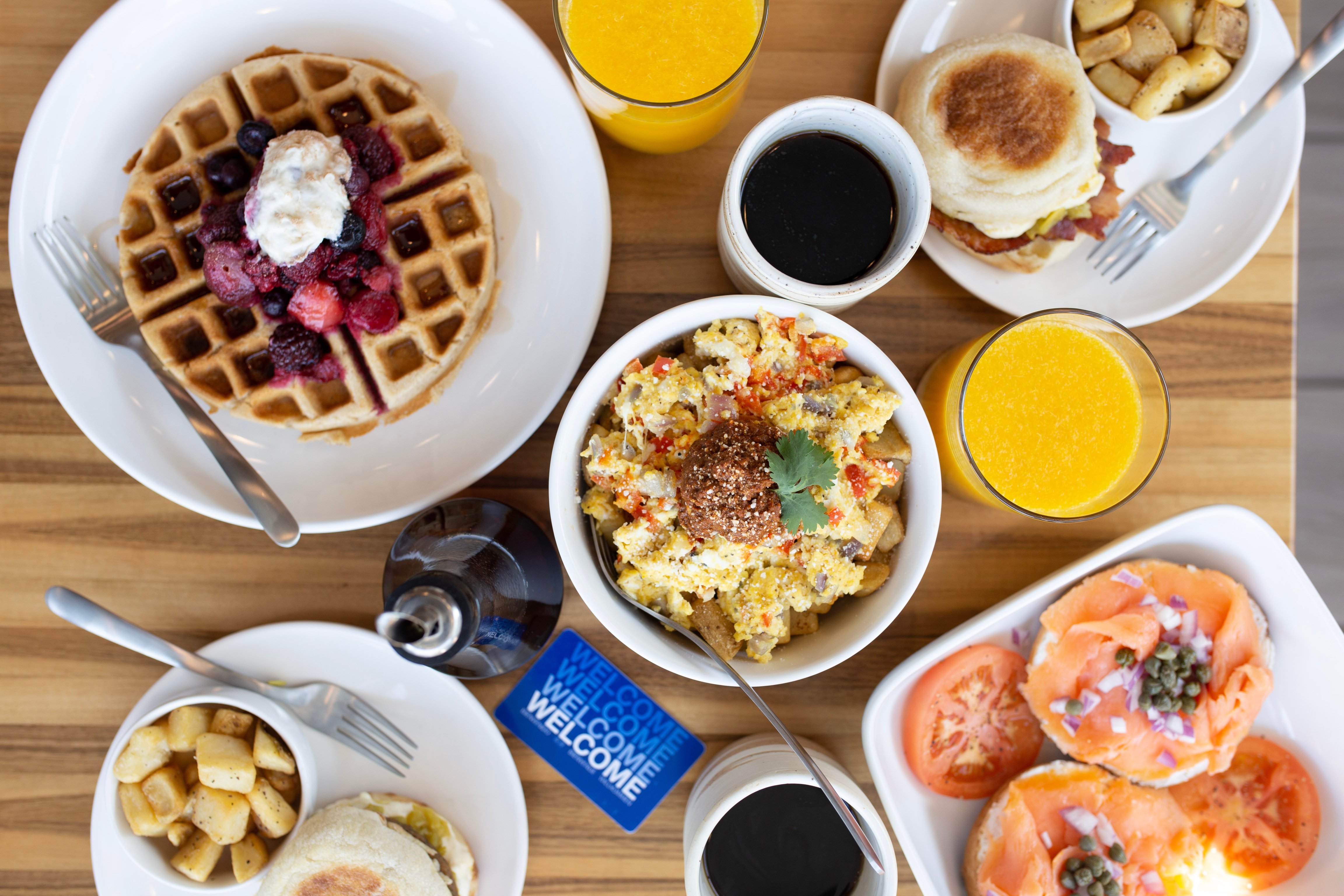 In keeping with things you yearn to eat and drink in the sun while splashing with new friends, Shady Cactus Swim Club at the pool bar serves up festive drinks and shareable Baja-inspired small plates. Chili-dusted chicken fingers, yucca fries, nachos, and street tacos pair well with fun, frozen drinks like Barbie in the Barrio, a vivacious blend of rosé, vodka, strawberry, and lemon. If you’re feeling bold, try The Greenhorn (blanco tequila, Ancho Reyes Verde, sweet & sour, lime, Tajin), sure to make its mark. When morning rolls around, grab some breakfast burritos, waffles, and upscale coffee, which makes starting the day downright easy.