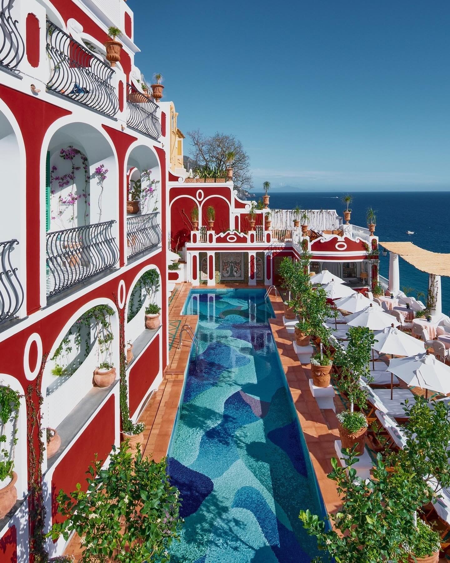 Situated in the peaceful (and less crowded) village of Praiano, Casa Angelina is a modern boutique hotel known for its minimalist design. Characterized by sleek white interiors that perfectly frame views of the Mediterranean Sea, this hotel is the definition of sophisticated. Be sure to check out Un Piano nel Cielo (the hotel’s rooftop restaurant) and the secluded beach below.