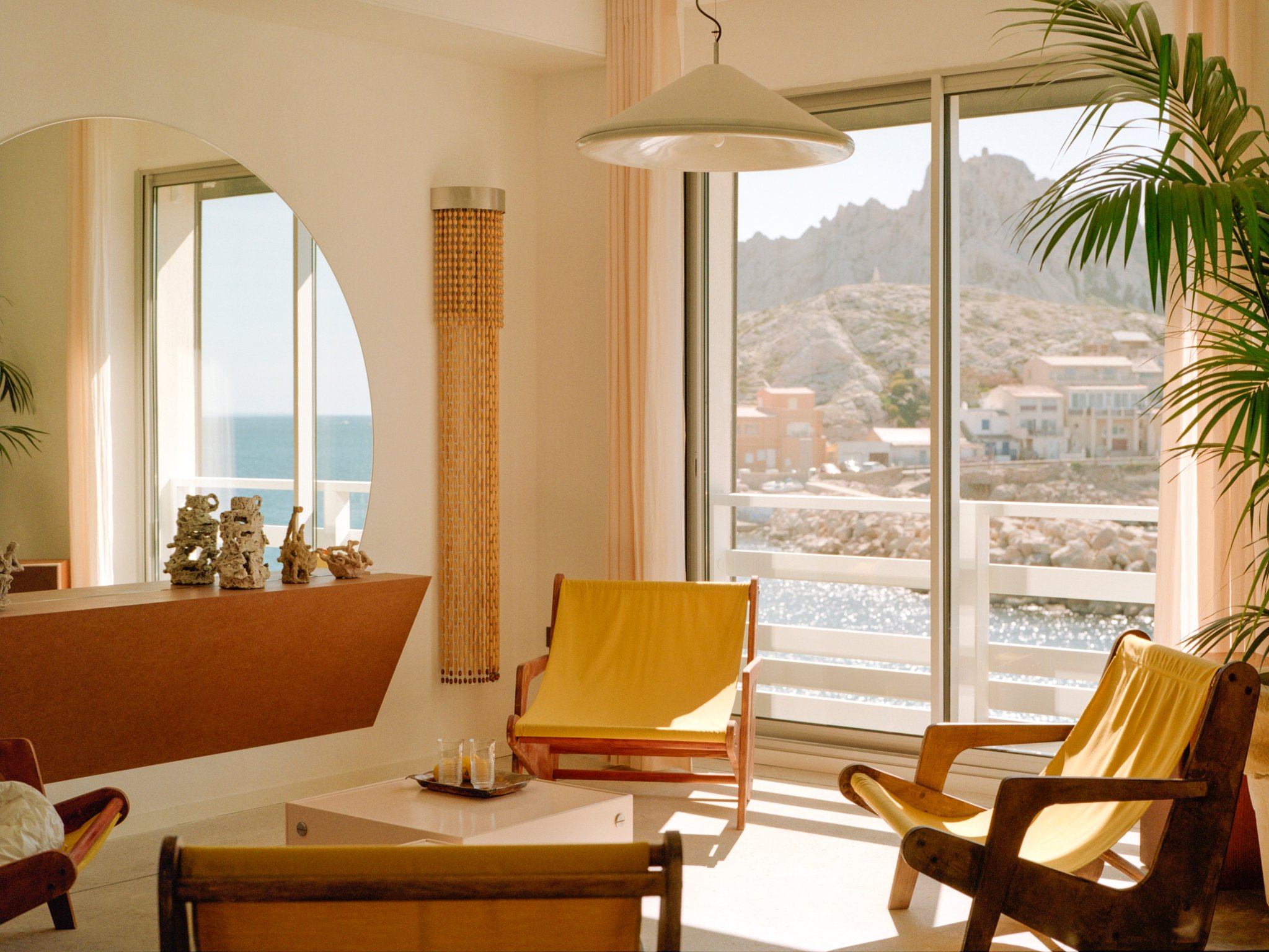 Removed from the city’s frenzy, locals, creatives, and travelers alike flock to this little oasis all year round to bask on the private beach or linger over sunset drinks and dinner. Rumor has it designer Jacquemus counts it among his favorite spots in Marseille. As in true Marseille fashion, the hotel’s “beach” is in truth more of a sun-drenched rock with a ladder leading straight into the sea, studded with the now-iconic yellow-striped loungers that take over our Instagram feeds every summer.