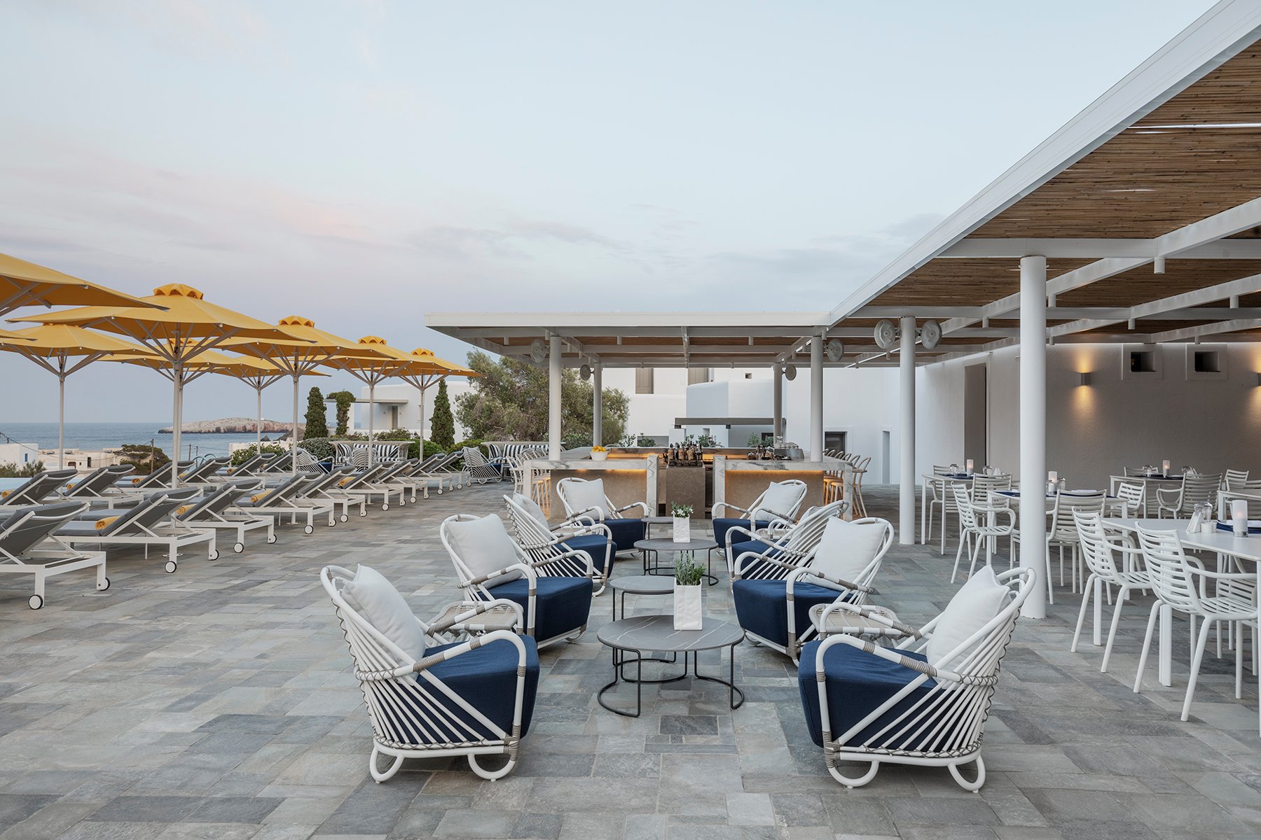 While dining locally in Chora and Karavostasis—the island’s two main Cycladic villages—is encouraged, guests can rest assured that the Anemi Restaurant is also a wonderful option. The eatery captures the essence of Mediterranean cuisine with an all-day menu, serving dishes such as saffron fish soup, fried zucchini balls, and traditional cheese pie kataifi—a sister dish to baklava made with thinly shredded filo dough. In the morning, opt for in-room dining to sip Greek coffee or a Cappuccino Fredo from the comfort of your deck, with the sea breeze blowing through the air.