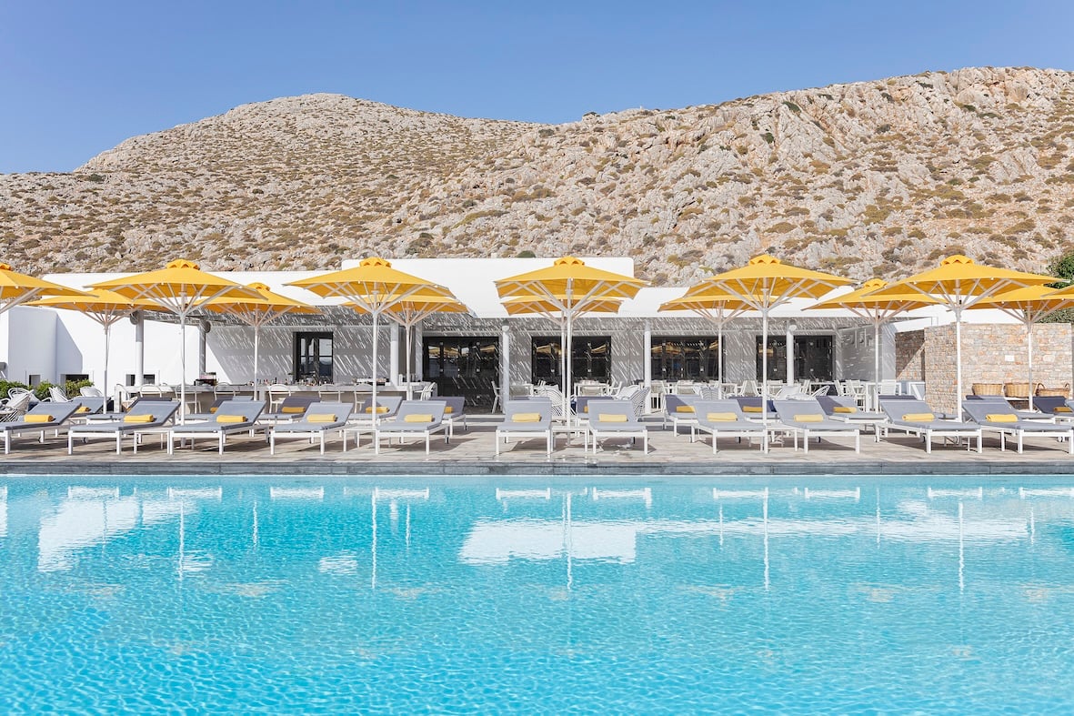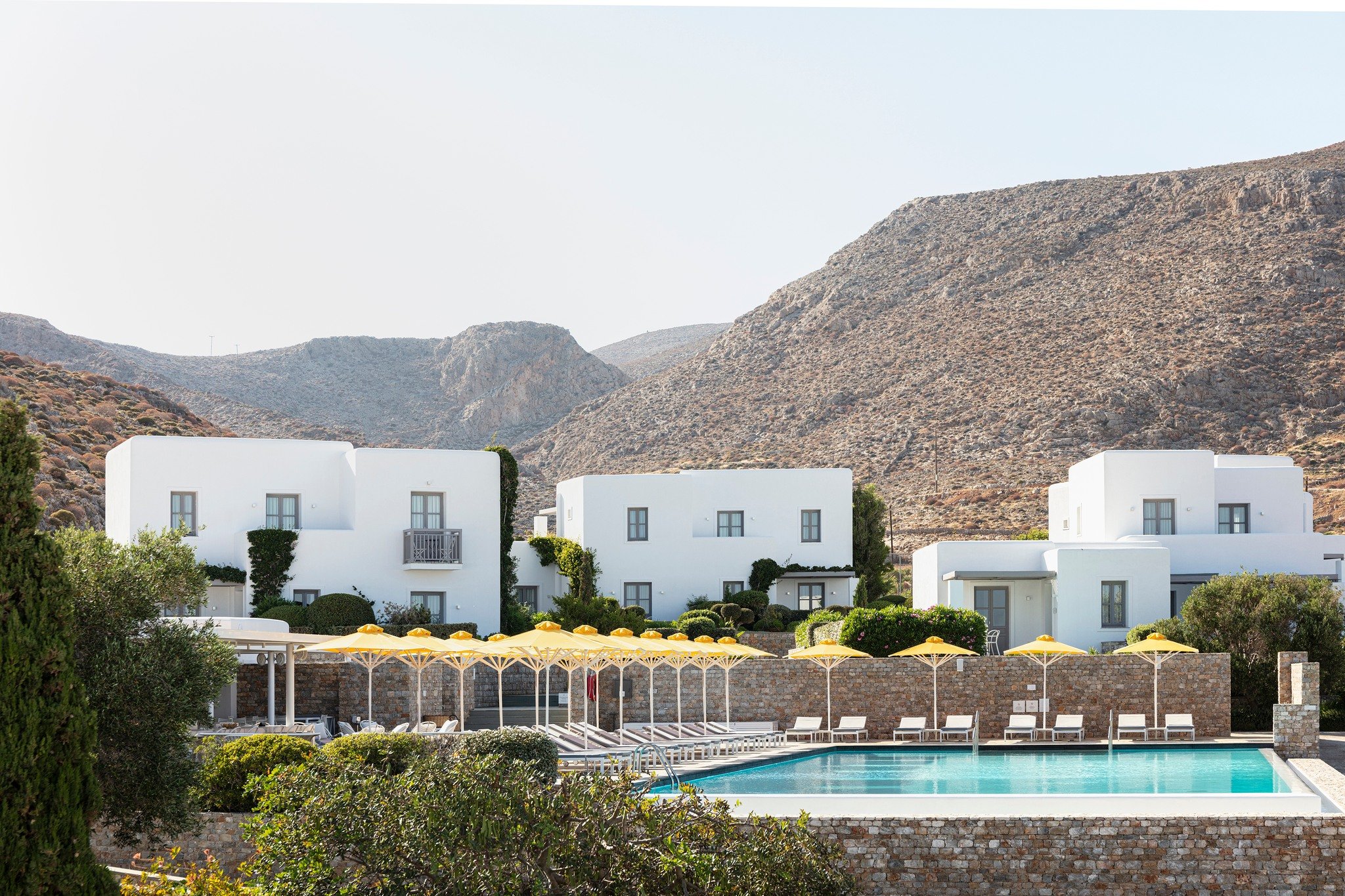 Wandering through the manicured grounds, guests are first impressed by the show-stopping turquoise swimming pool, flanked by vibrant yellow umbrellas and sun chairs. Pristine, Cycladic-style abodes dot the property, making visitors feel as if they’re roaming around their own authentic Greek village.