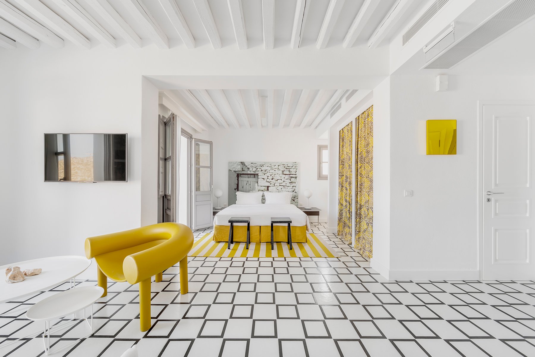 Our Favorite Part of the Hotel: It’s undoubtedly the glittering turquoise swimming pool, which takes center stage and overlooks the Aegean Sea. If we had to pick a second, it would be the yellow accent color that decorates the grounds, adding this happy tone to the stay.