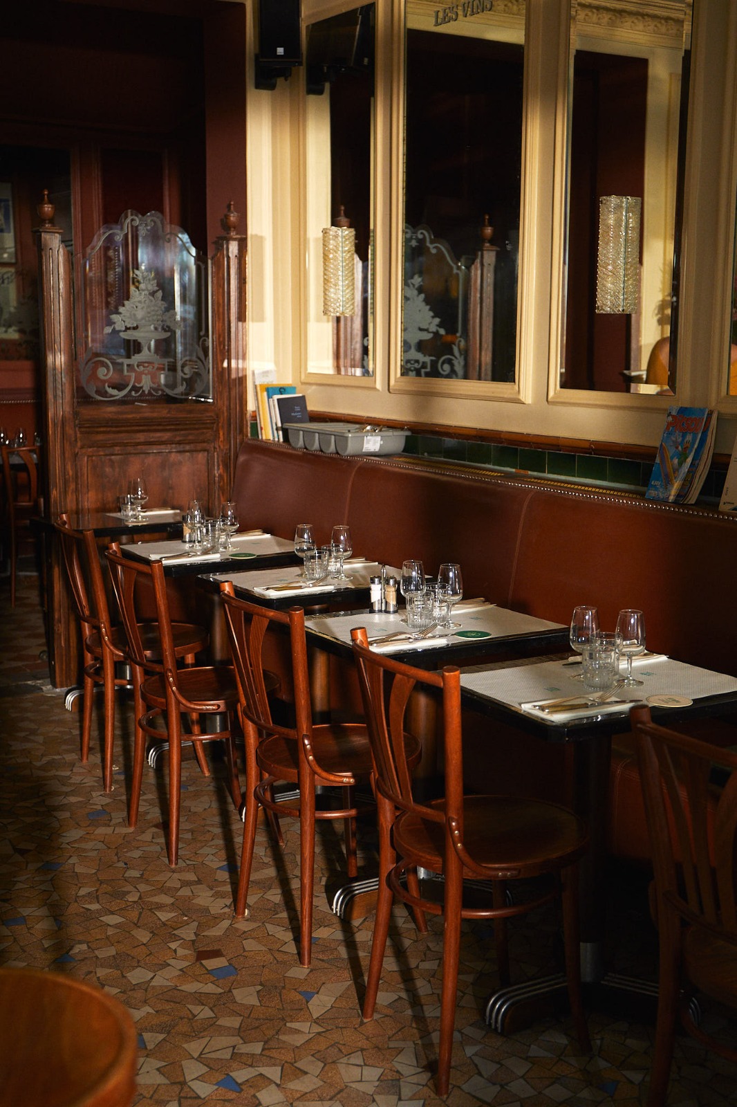 Preserving the institution’s cultural and architectural framework was at the forefront of their collective vision while ensuring the restaurant maintains its sense of place in the future. Thus, this project focused more on “revealing more than renovating.” The carved wooden bar remains intact as the central feature of the bistro. The antique banquettes have been restored to their original splendor. As for the floors––they have not been touched. Brown paint from the 2000s was simply scraped away, revealing a previously concealed tile fresco. Outside, tasteful woven chairs circle brass-rimmed tabletops below the glow of the cardinal neon sign.