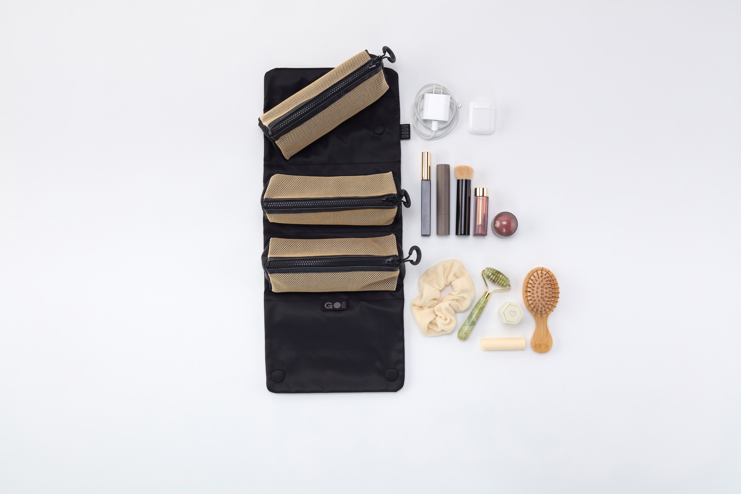 Inside, you'll find three removable, magnetic, recycled mesh, and nylon zip pouches that secure all your items. If you need to remove them to tuck them into other pockets of space, you can easily do so. This kit's organizational capabilities are unbeatable. It comes in quicksilver-metallic (silver), onyx (black), and coffee gold metallic (gold), all with a durable, scuff-free exterior, making tossing it around stress-free, which I loved during my trip.