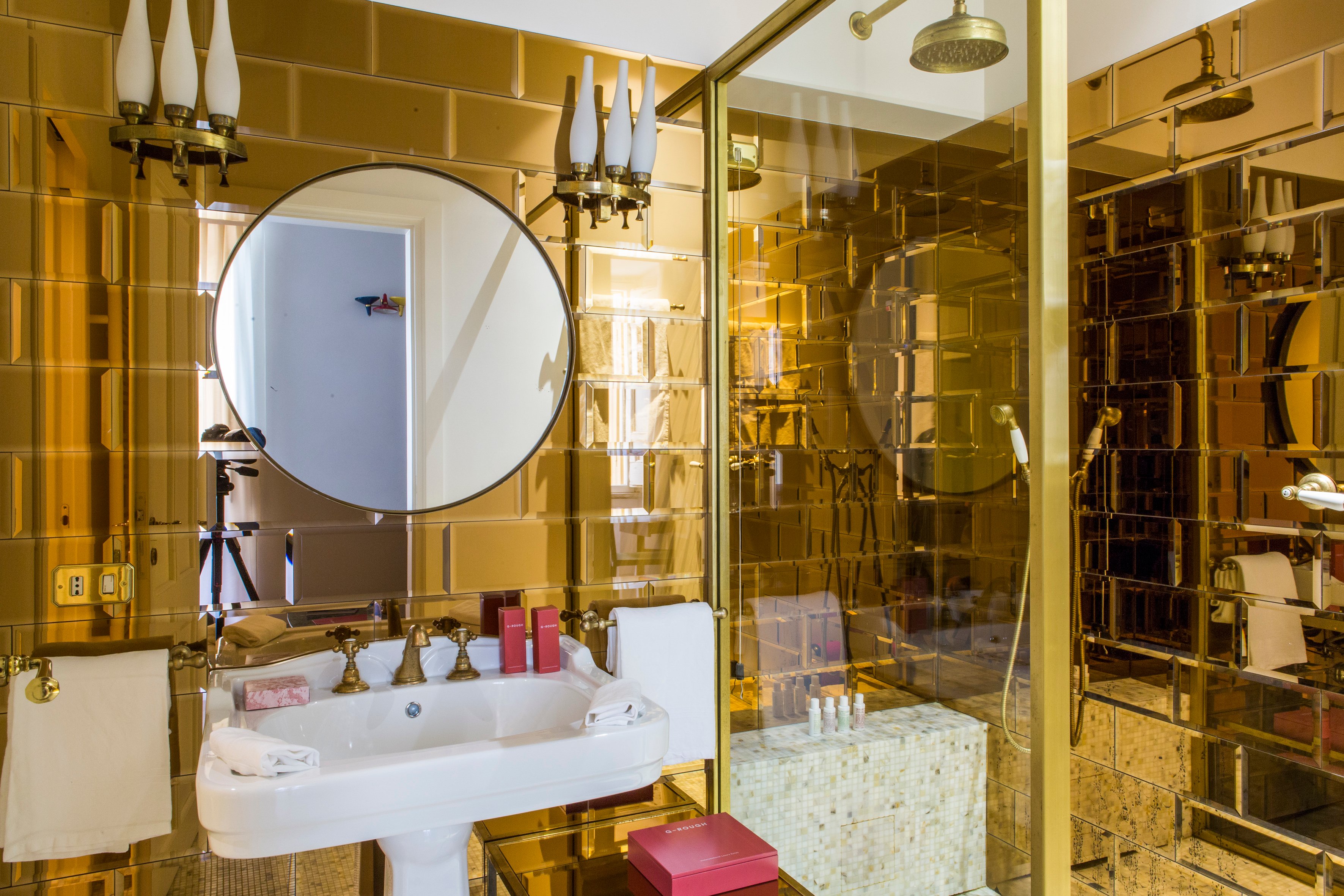Rather than swarm a reception area upon arrival, guests check in at Gallery Bar, a dramatic all-day cocktail and coffee bar adorned with glimmering mirrored tiles, a brushed-brass counter, and vintage leather seating arrangements. Local wines, signature cocktails, and aperitivo in an informal yet sophisticated atmosphere are enjoyed by hotel guests while rubbing elbows with Rome’s haut monde.