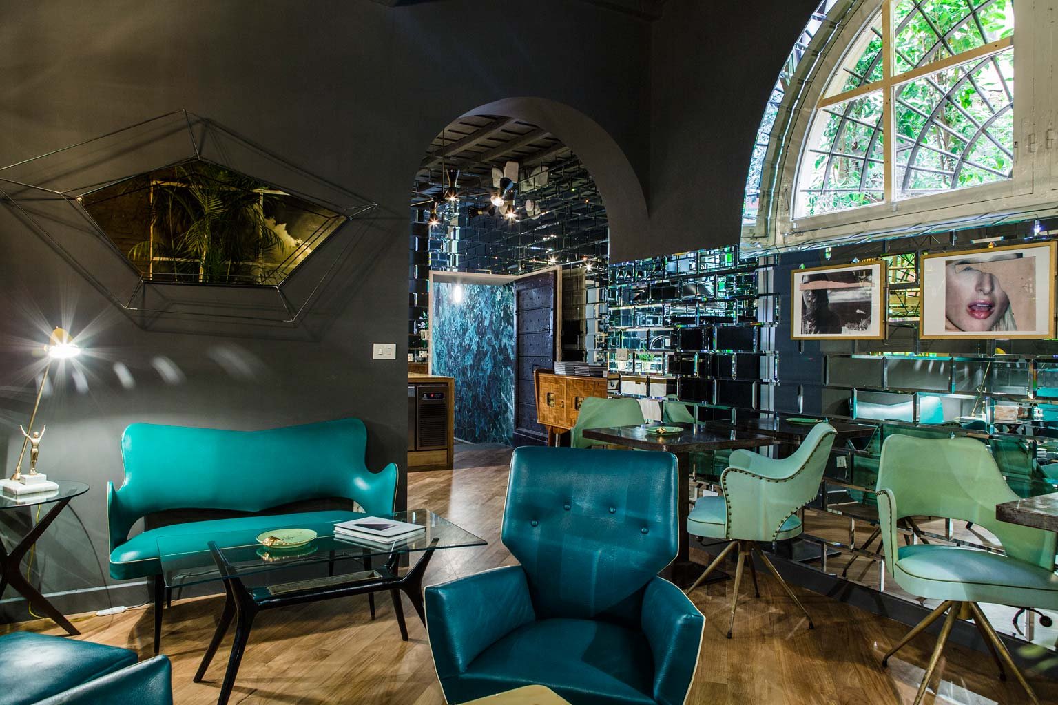 Upstairs, each of the suites offer distinctive personalities: some are more elegant, while others are more romantically suited. Yet, all are inspired by Italian designers of the 1930s-1950s. Annexed living rooms house dining tables, Smeg refrigerators, and kitchenettes. Each suite is complete with dark-mirrored tiles and two-tone cast-iron showers. The two penthouse suites on the uppermost floor can be joined together to make up more than 2,000 square feet; both have mezzanine bedrooms, clawfoot bathtubs, and rooftop terraces with grand views of the city.
