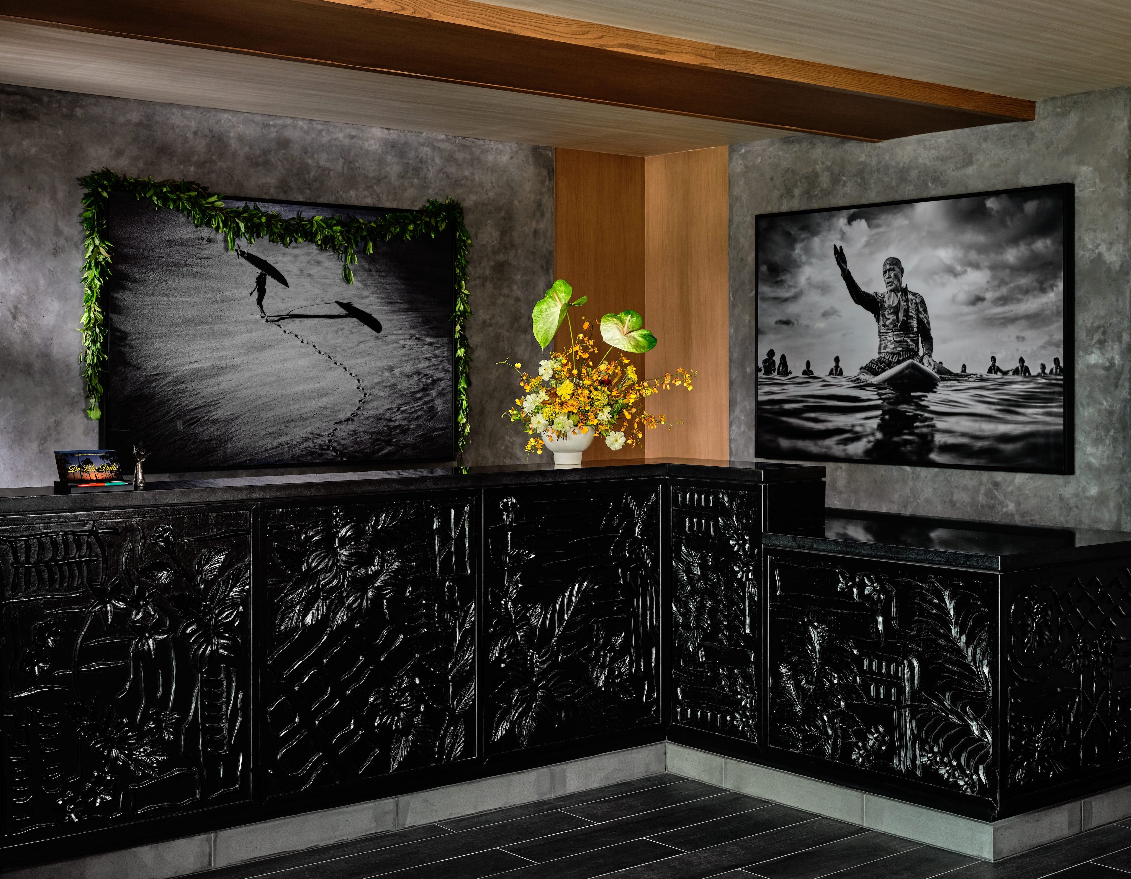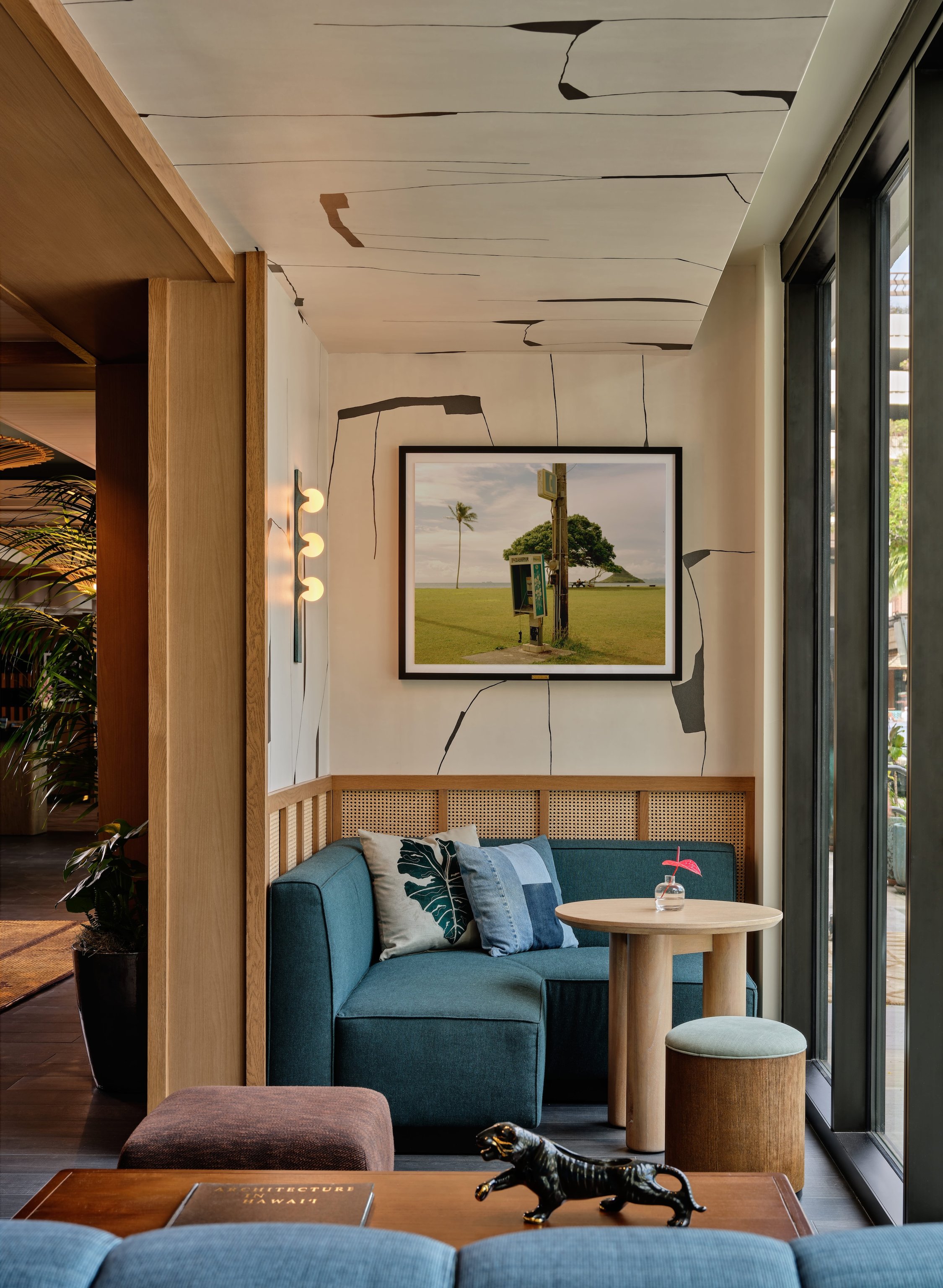 Throughout the public spaces, you’ll see modern art by local artists. Pieces by well-known surf photographer Arto Saari are behind the check-in desk, and there’s a rotating gallery of work lining the halls — abstract paintings by Chelsea Kinch were featured as the opening installation. Near the pool is a mural inspired by Hawaiian fishponds by Cory Kamehanaokalā Holt Taum.