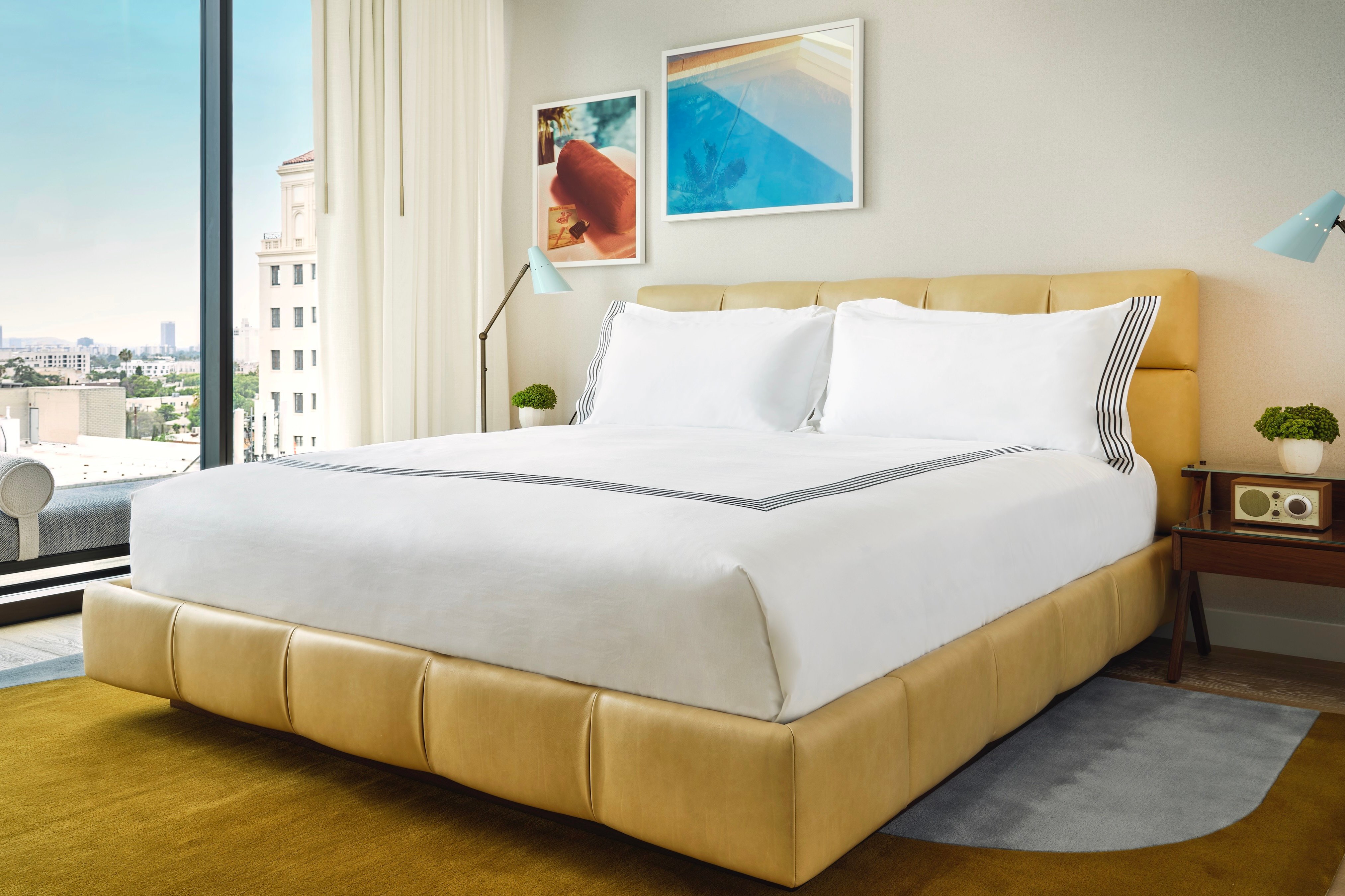 Spread across 11 levels, the 190 guest rooms, including 16 suites, lean into this West Coast Modernism aesthetic. Floor-to-ceiling windows give way to California sunshine spilling in each morning, and views of the Hollywood Hills, sinking in the feeling that you’re in Los Angeles after all. Velvet bed headboards, golden-hued rugs, and en suite bathrooms with Salt & Stone products. (Dare I say the sign of a good boutique hotel is based on their amenities like this? Fine, then, I said it! This one aces the test.)