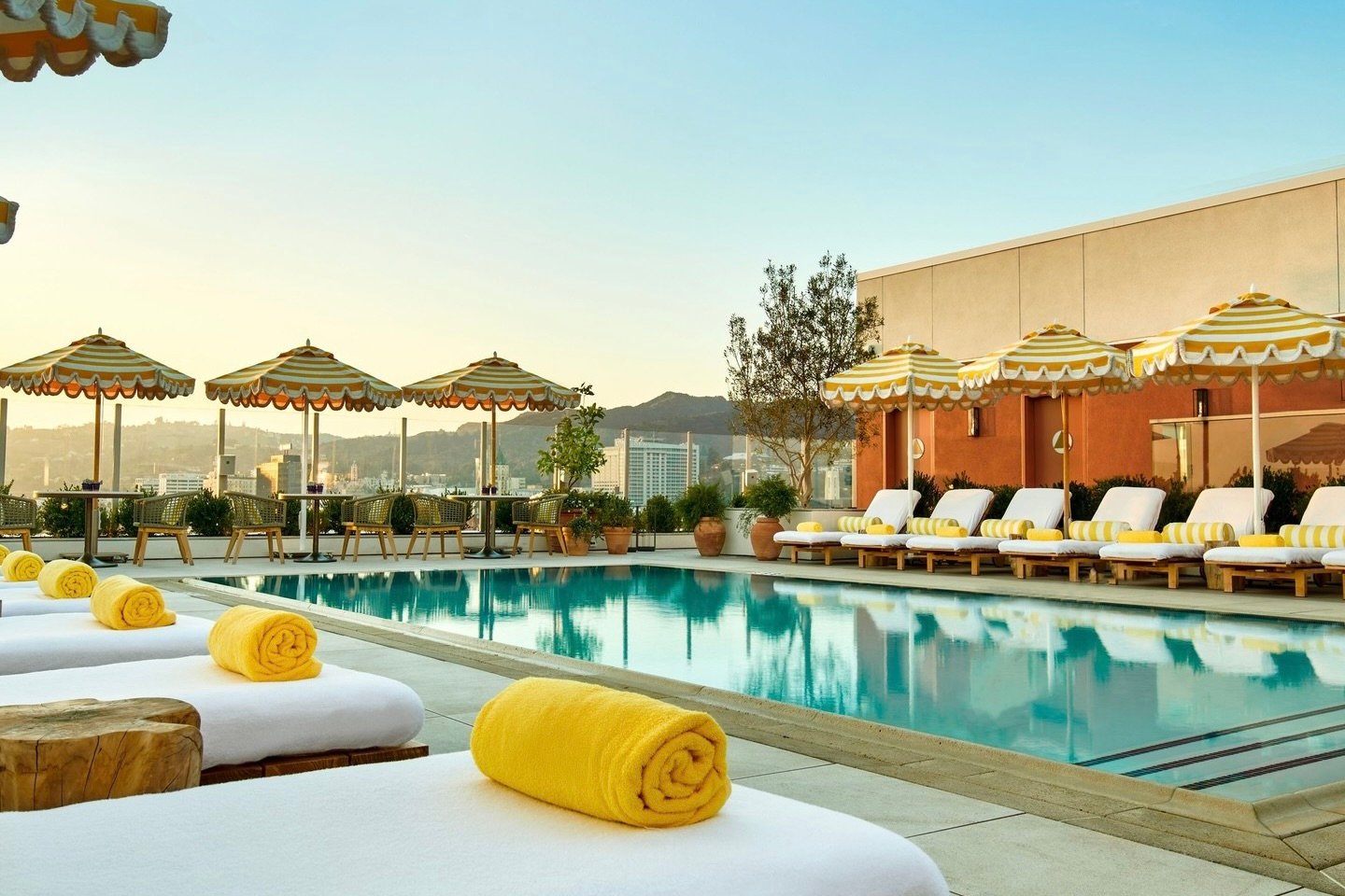 Up on the pool deck, the Downtown LA skyline is your backdrop. Yellow-and-white ruffled umbrellas, loungers, and sunny West Coast vibes make it feel like a European summer escape. Order a “Mon Chéri” cocktail, kick back, and stay awhile.