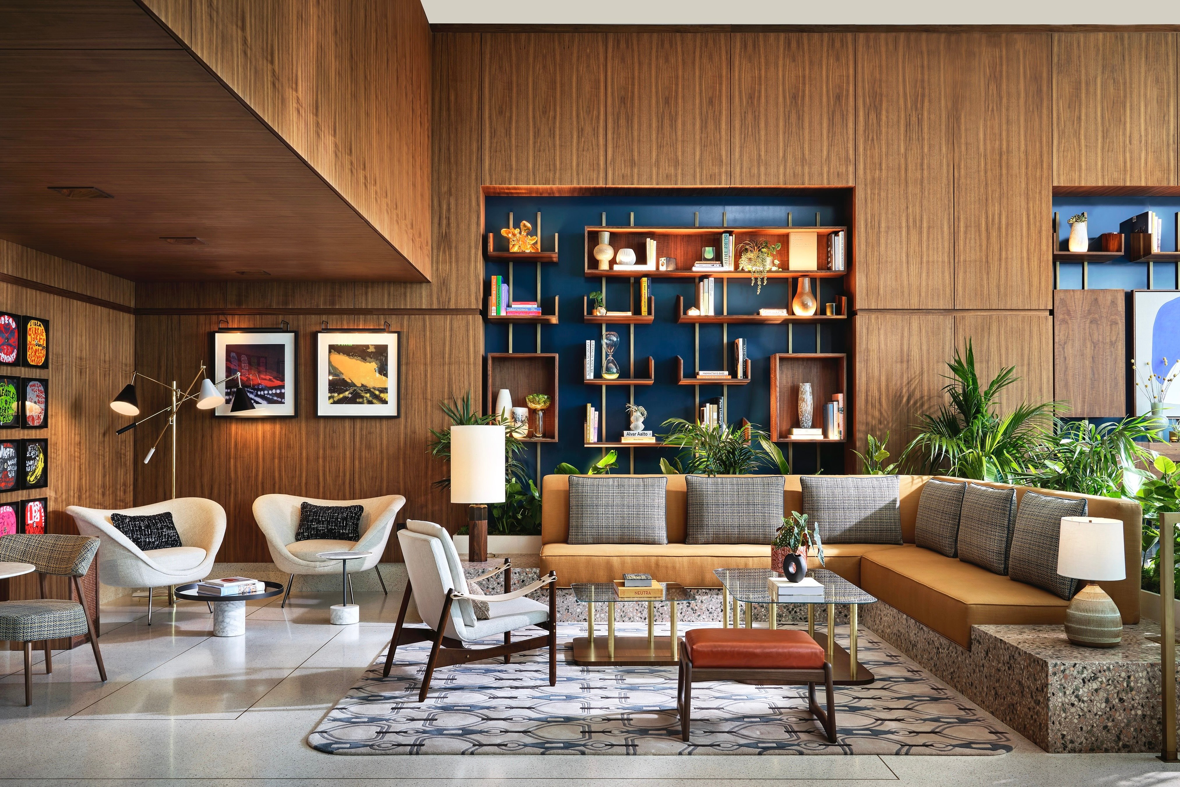 Formerly the Thompson Hollywood, the reimagined Autograph Collection hotel kept its bones but infused them with polished mid-century cool. Guests arrive through a soaring, leafy trellis-covered walkway that opens to an expansive lobby. Inside, lounge-worthy corners are dotted with bespoke couches and Assouline coffee-table tomes (don’t miss “Cinema on Paper”—a wink to its cinematic address). Warm timber walls wrap the space in 1970s-modern living room vibes, inviting you to linger, cocktail in hand, at the terrazzo-topped bar.